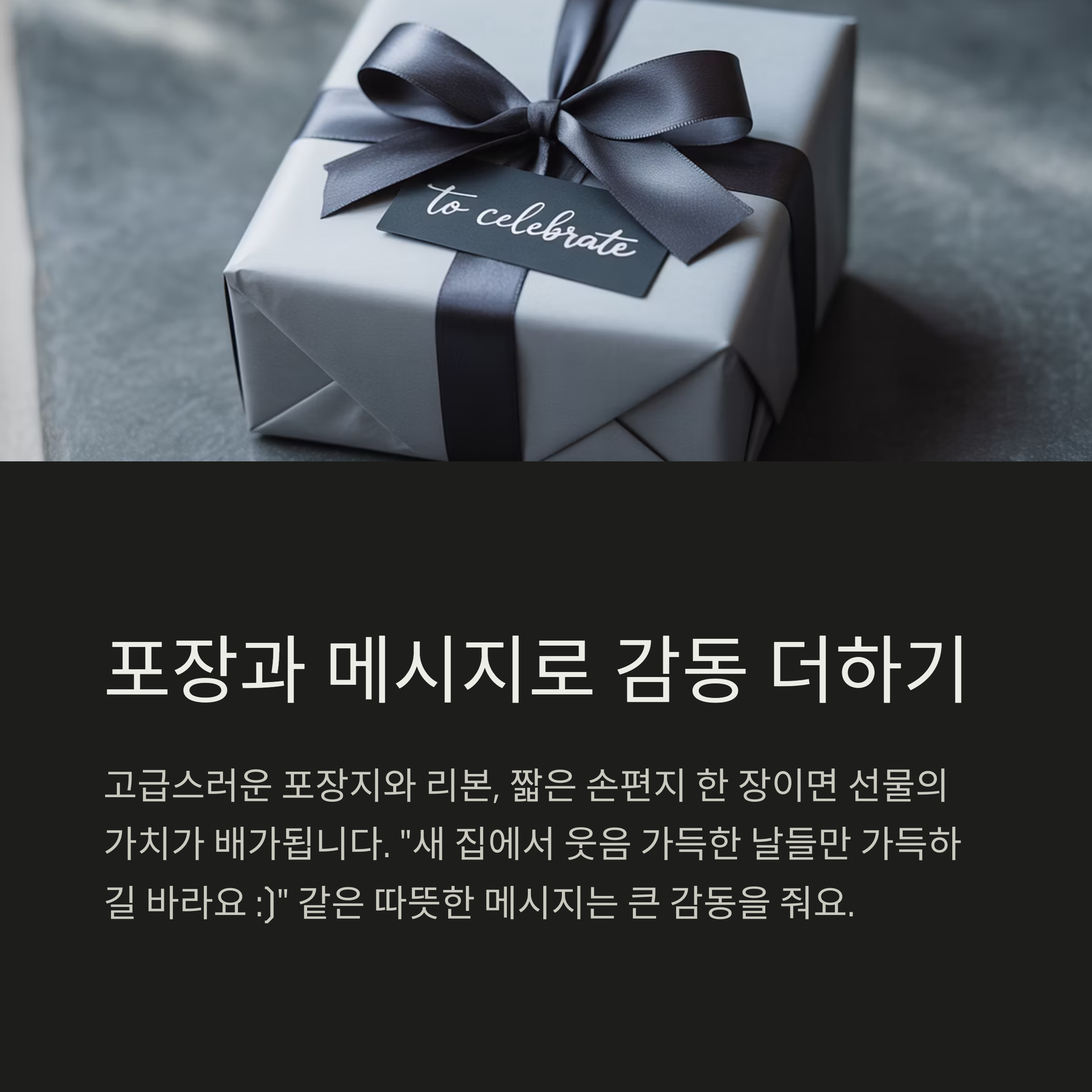 집들이 선물은 포장도 중요합니다. 고급스러운 포장지나 리본을 사용하고, 짧은 손편지나 메시지 카드 한 장만 더해도 분위기가 확 달라집니다.