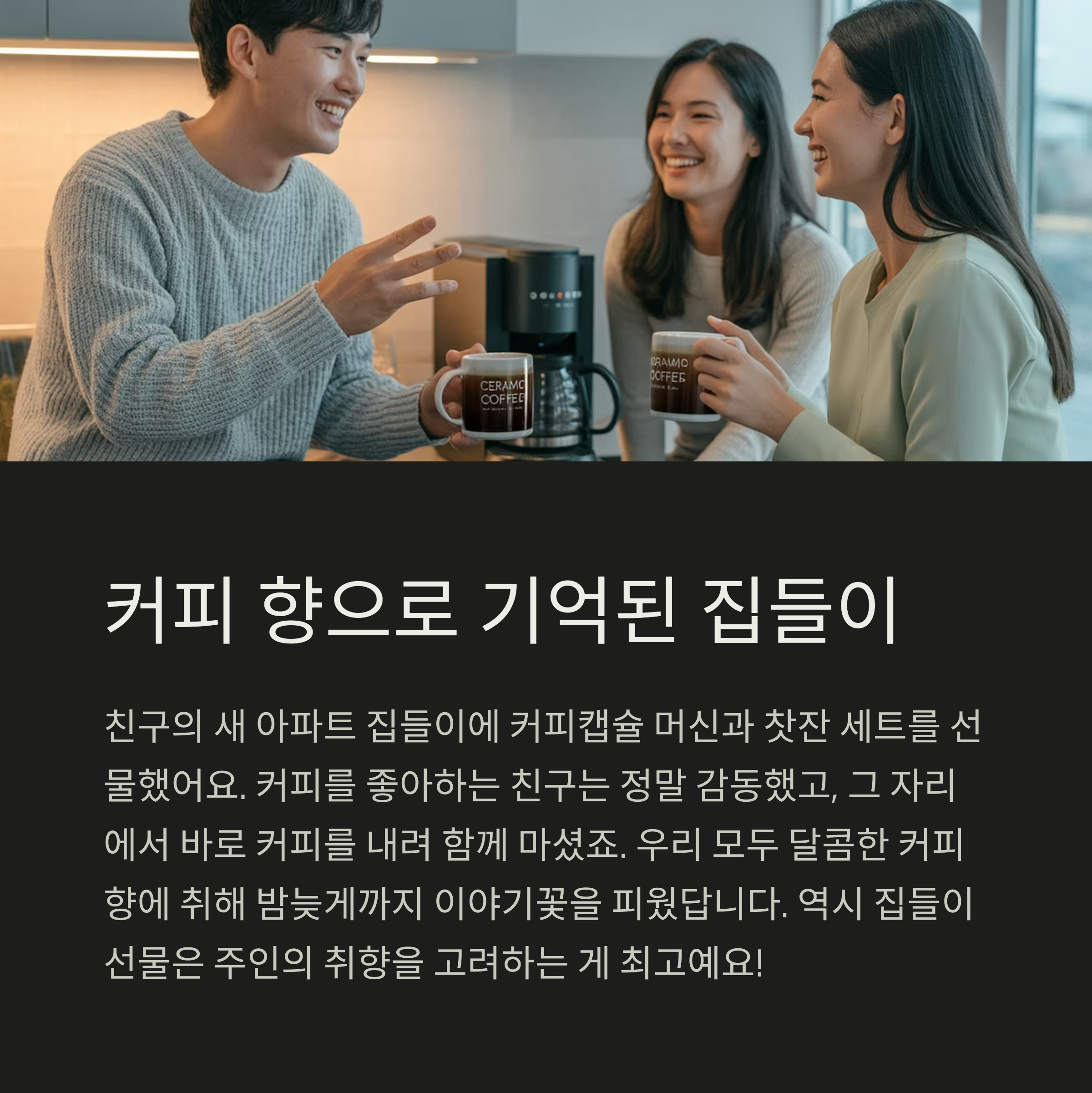 얼마 전, 친구가 새 아파트로 이사하면서 집들이를 초대했어요. 고민 끝에 커피캡슐 머신과 함께 향 좋은 핸드드립 세트를 선물했는데, 평소 커피를 좋아하던 친구는 감동 그 자체였어요. 덕분에 그날 손님들 모두가 드립커피 향에 취해 분위기까지 따뜻해졌죠.