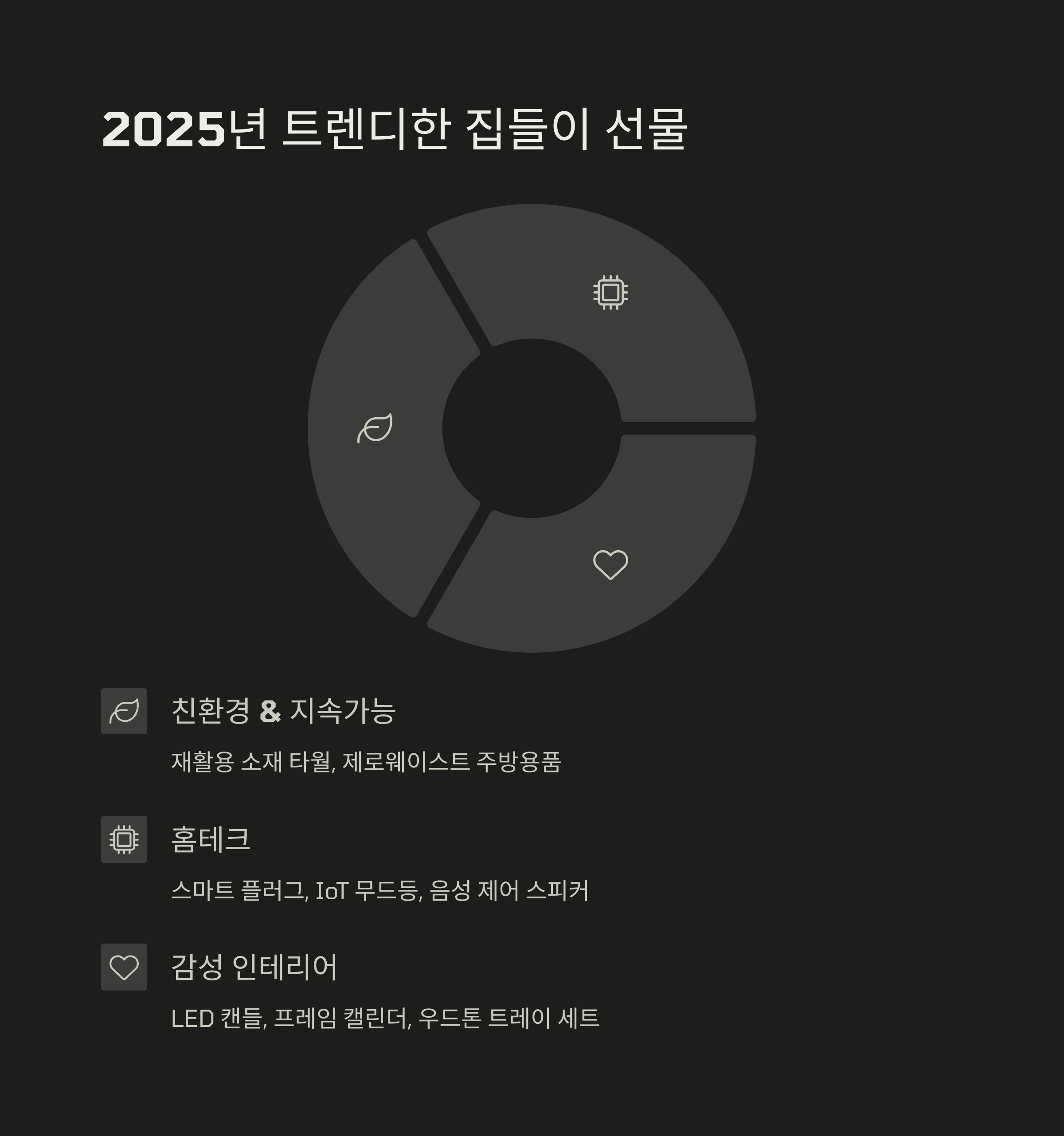 2025년 현재, 특히 인기 있는 집들이 선물 트렌드는 ‘지속가능성’과 ‘홈테크’입니다. 아래 표를 참고해보세요.