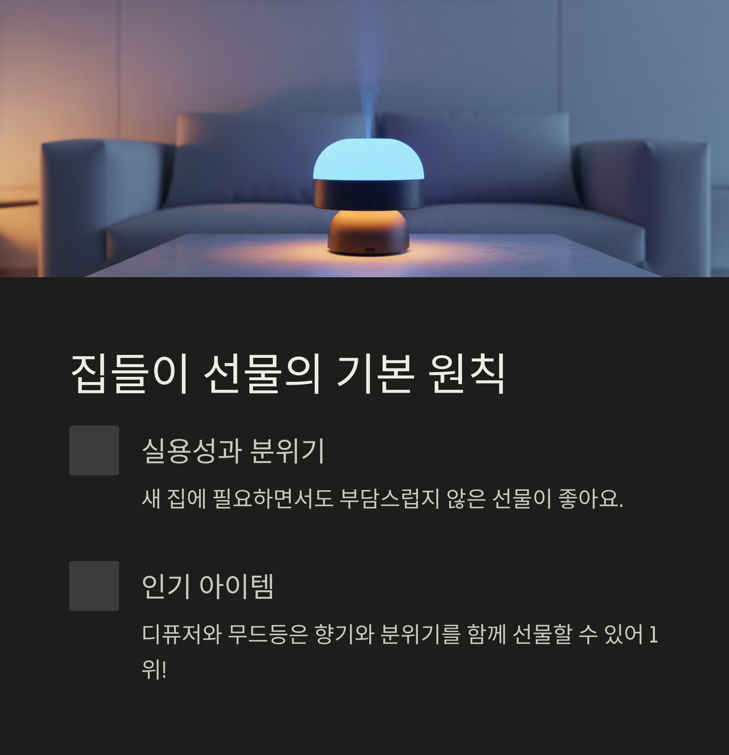 이처럼 상대의 취향을 파악해서 선물을 고르면 분위기까지 바뀌는 집들이가 될 수 있어요. 단순히 물건이 아니라, 기억에 남는 감정을 전하는 것이죠.