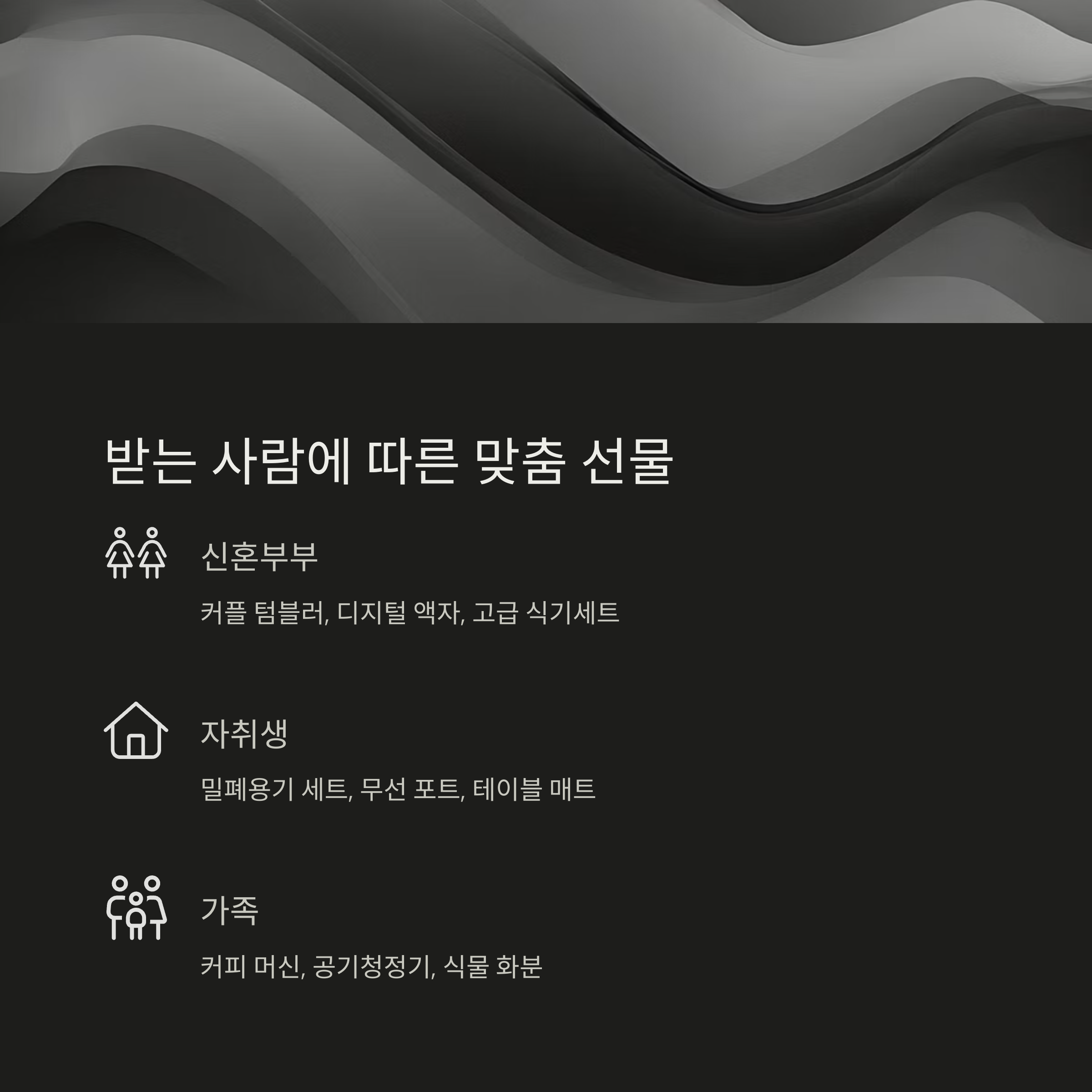 선물을 받는 사람이 누구냐에 따라서도 추천 아이템이 달라지겠죠? 예를 들어 신혼부부에게는 커플용 아이템이나 집안 분위기를 살릴 수 있는 소품이 좋고, 자취생에게는 생필품이나 실속 아이템이 훨씬 더 반가울 수 있어요.