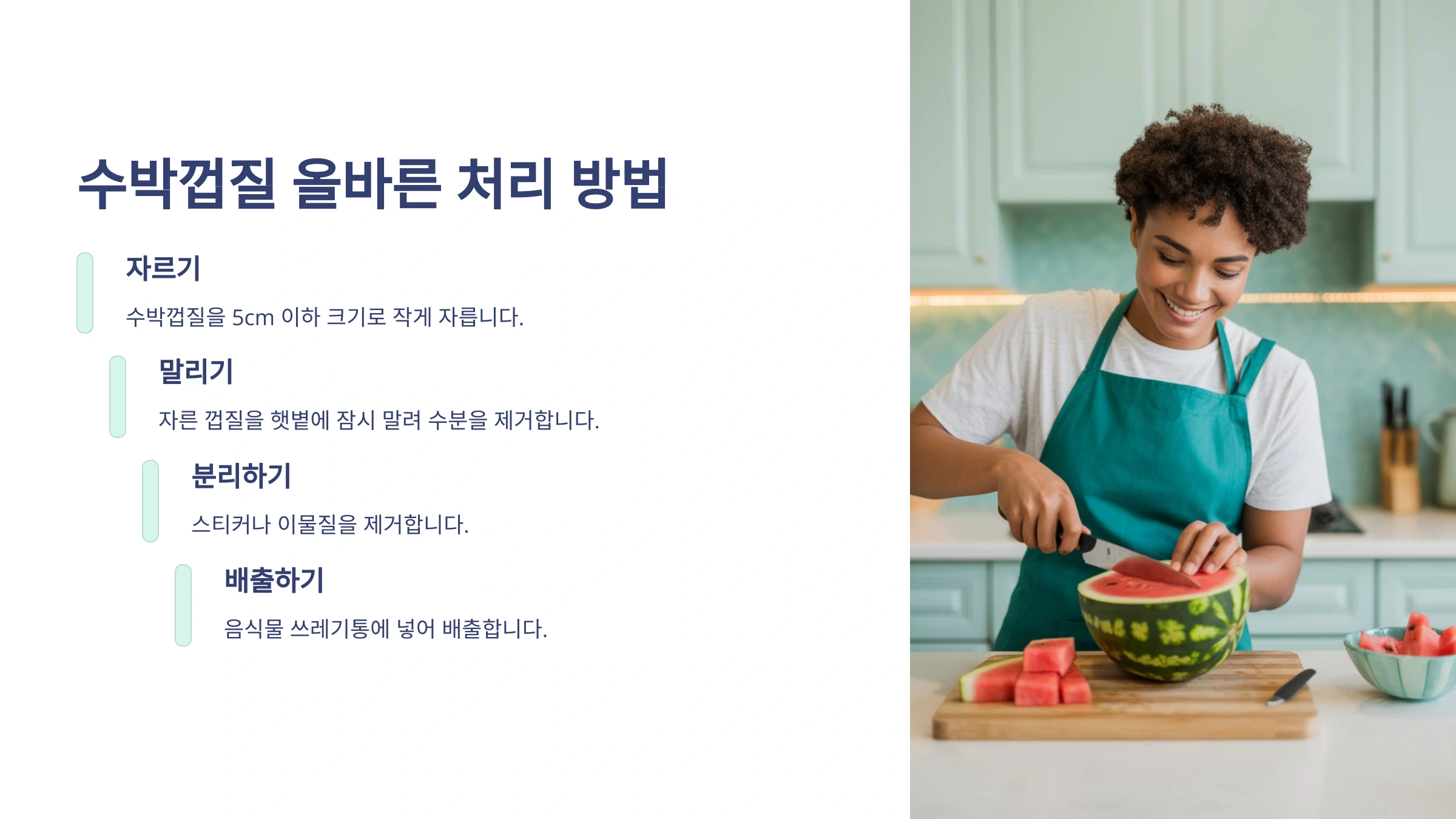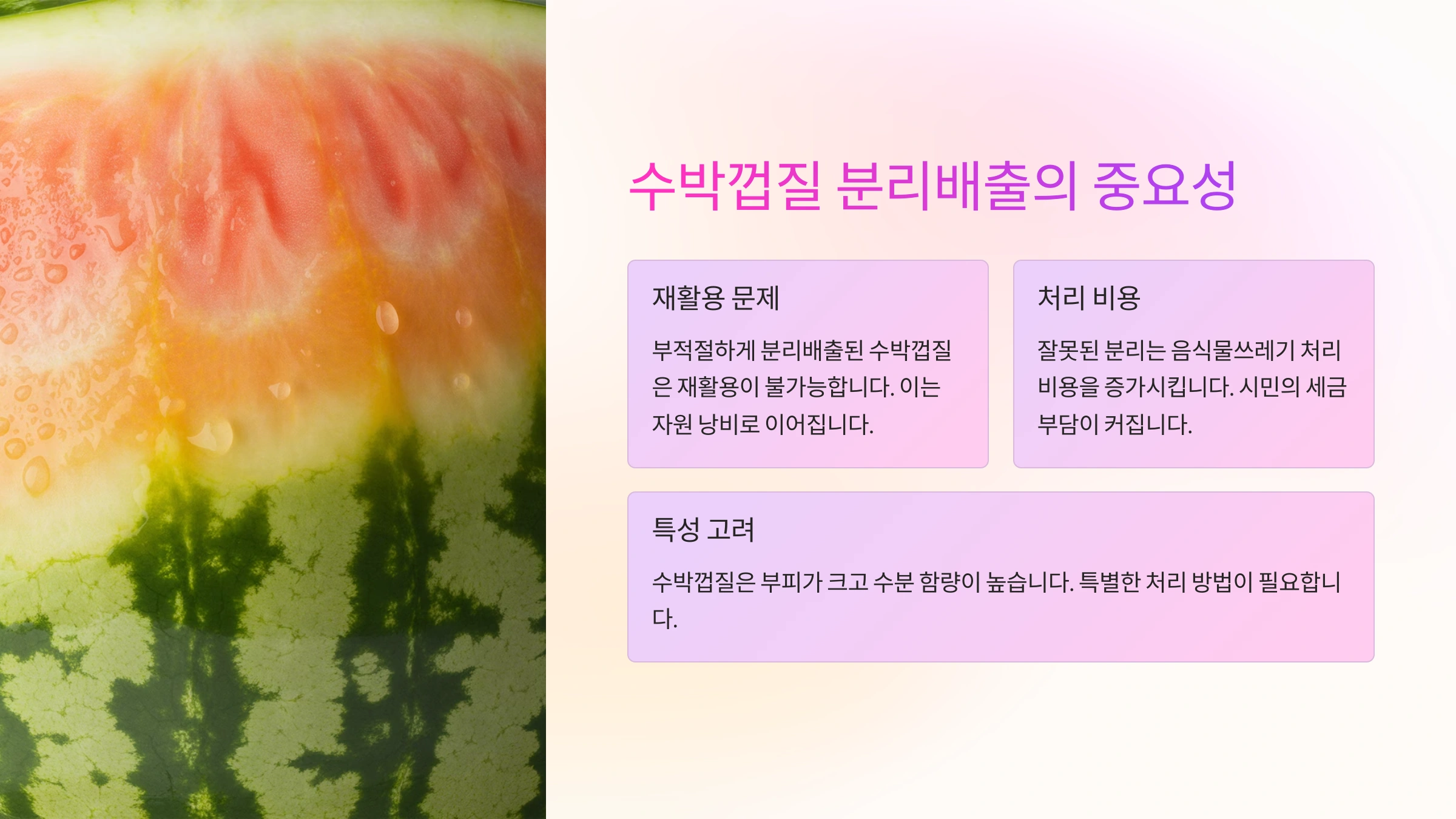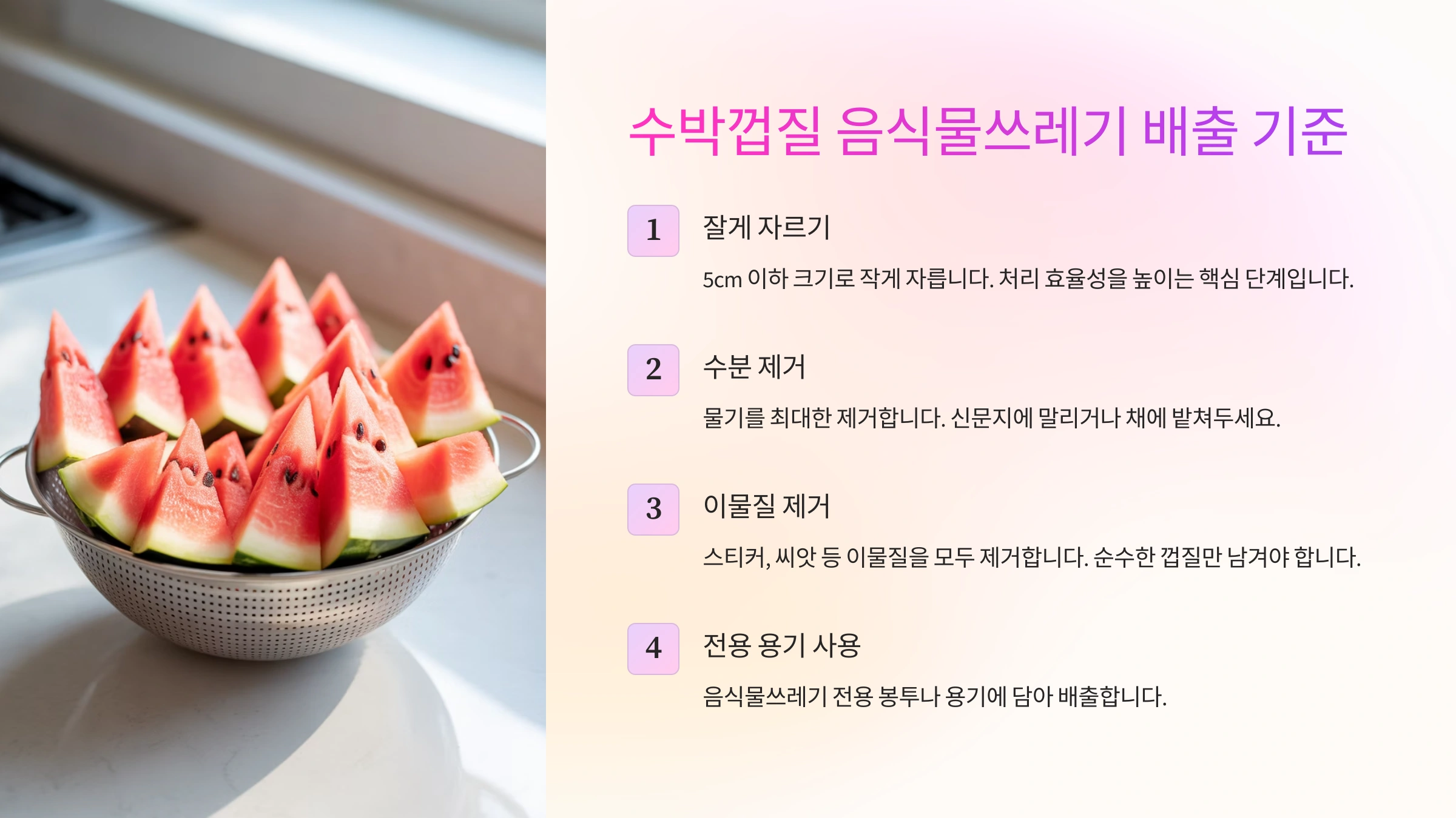 수박 껍질이 음식물 쓰레기인 건 알겠는데, 부피가 너무 커서 버릴 때마다 난감하셨죠? 조금만 신경 쓰면 훨씬 깔끔하고 효율적으로 버릴 수 있답니다.
