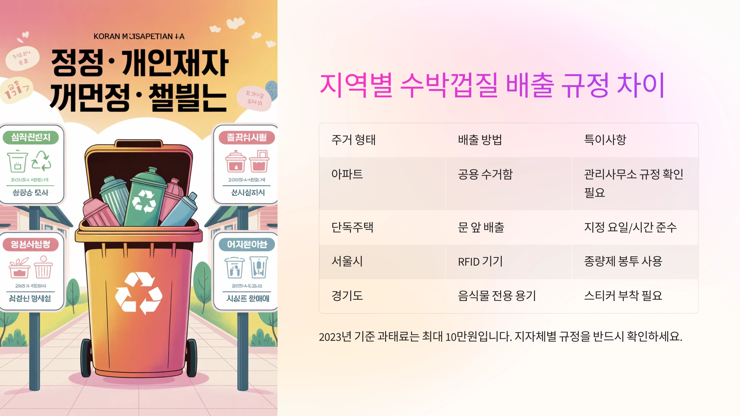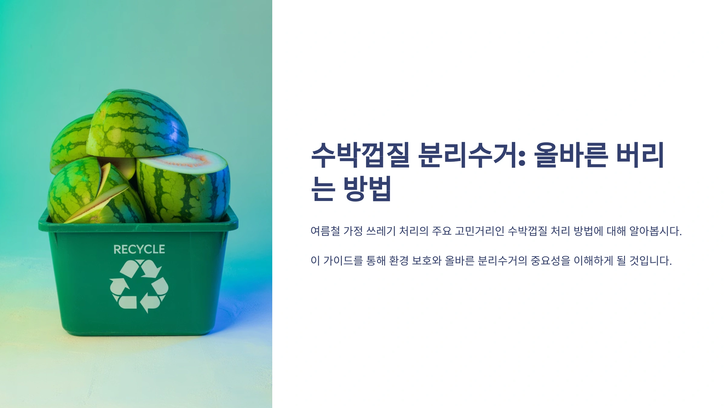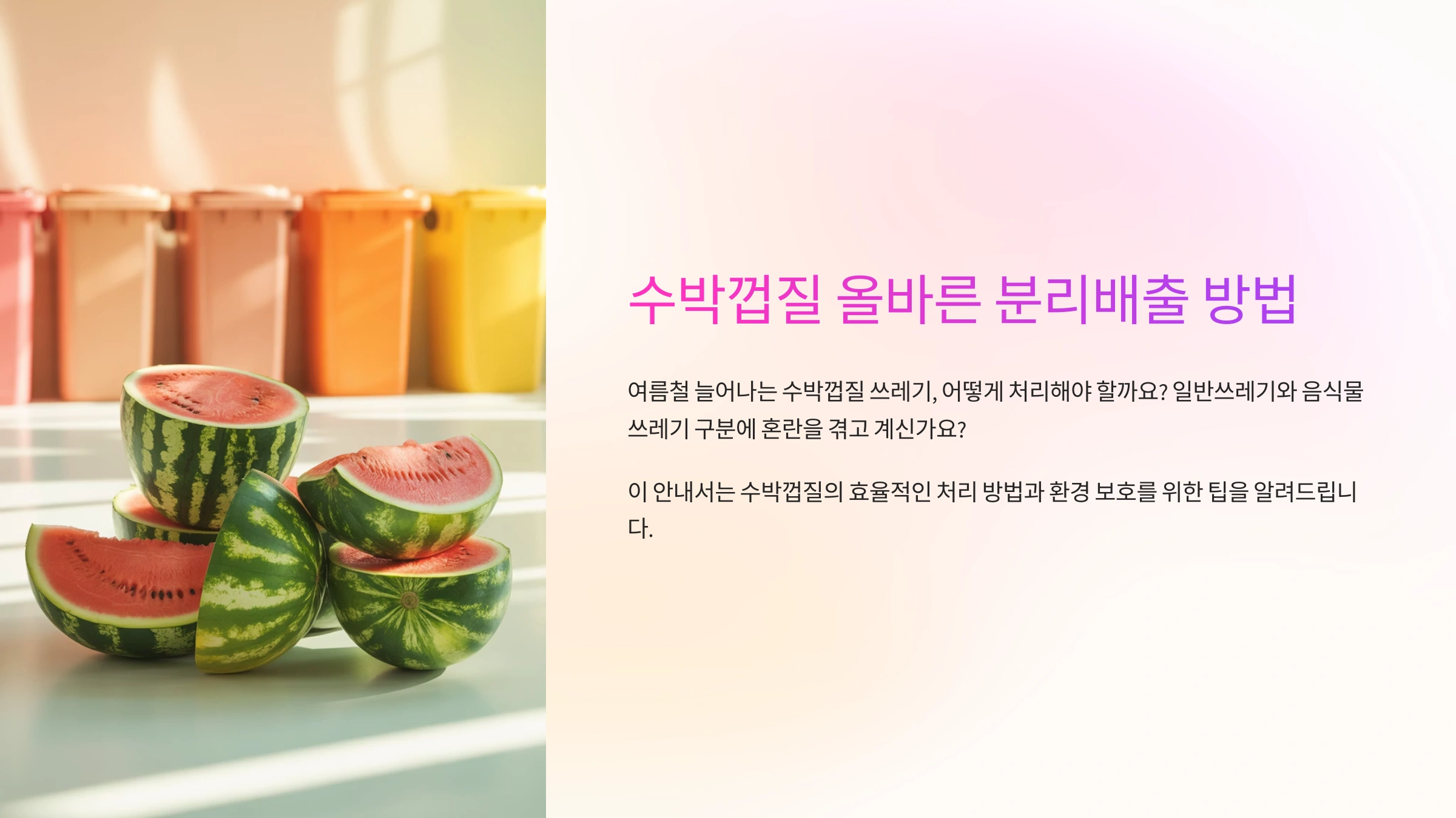 여름철 불청객 수박 껍질, 음식물 쓰레기? 일반 쓰레기? 시원한 수박을 먹고 난 뒤 산더미처럼 쌓이는 껍질! 더 이상 헷갈리지 마세요. 2025년 최신 분리수거 기준에 맞춰 수박 껍질을 어떻게 버려야 하는지, 현명한 처리 꿀팁까지 완벽하게 알려드립니다!