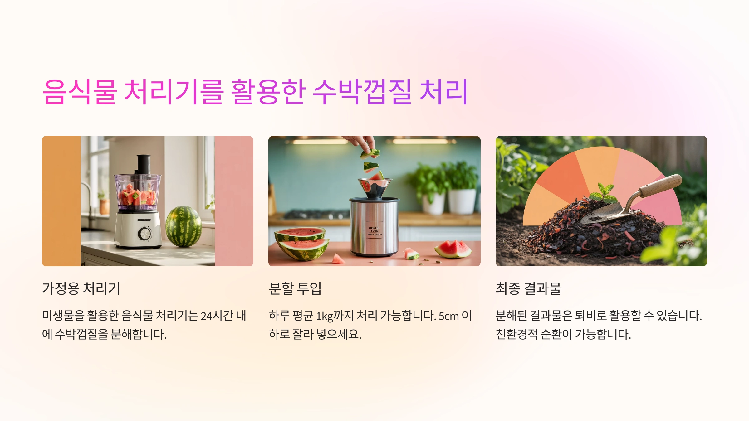 안녕하세요! 푹푹 찌는 더위가 기승을 부리는 여름, 여러분의 더위를 싹 가시게 해주는 건 무엇인가요? 저는 단연코 시원하고 달콤한 수박을 꼽고 싶어요. 🍉 온 가족이 둘러앉아 맛있게 먹고 나면 어느새 수북이 쌓이는 초록색 수박 껍질! 이걸 볼 때마다 잠시 고민에 빠지곤 하죠. '이걸 그냥 음식물 쓰레기통에 버려도 되나?' 하고요. 저만 그런 거 아니죠? 😊 오늘은 이 지긋지긋한 고민을 한 방에 해결해 드릴게요!