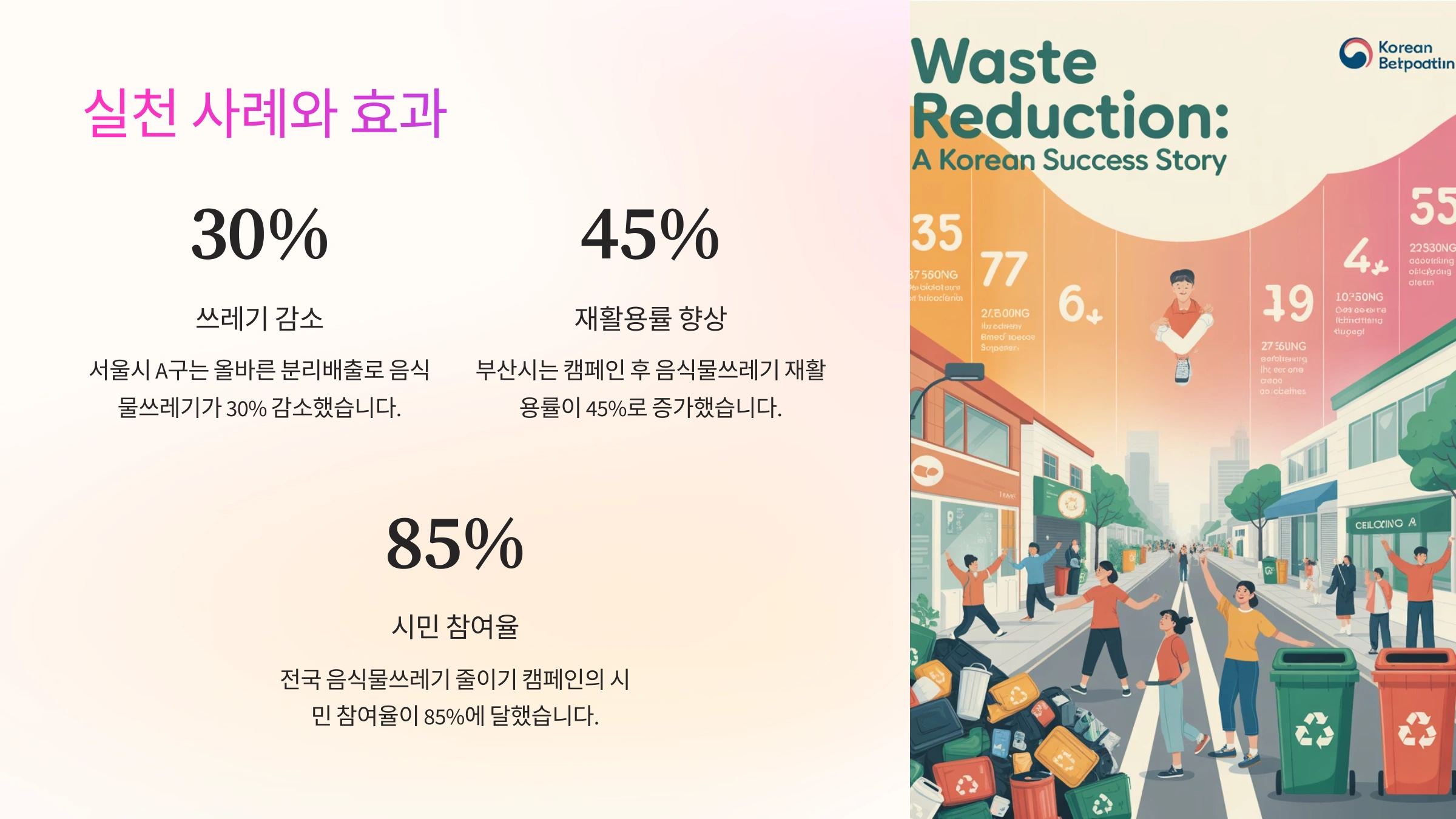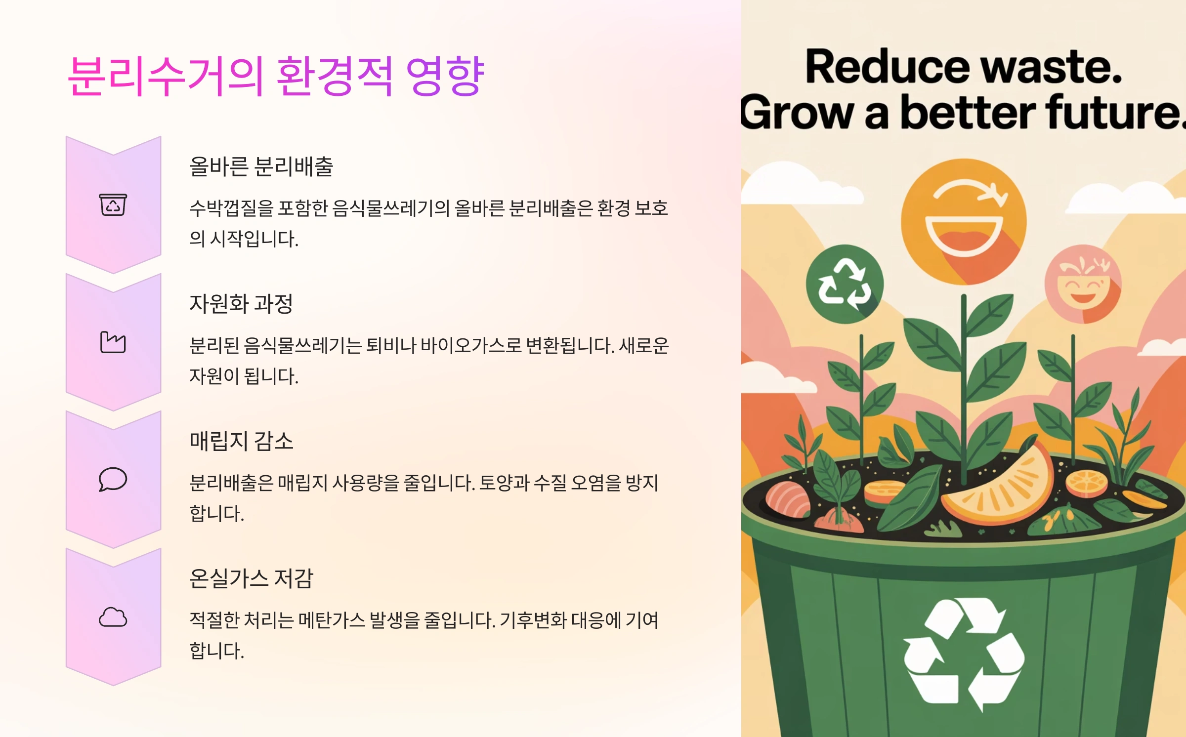 이렇게 분리배출된 음식물 쓰레기는 살균 및 건조 과정을 거쳐 동물의 사료나 퇴비, 바이오 에너지 등으로 재탄생한다고 해요. 우리가 조금만 신경 써서 분리배출하면 소중한 자원으로 재활용될 수 있는 거죠.