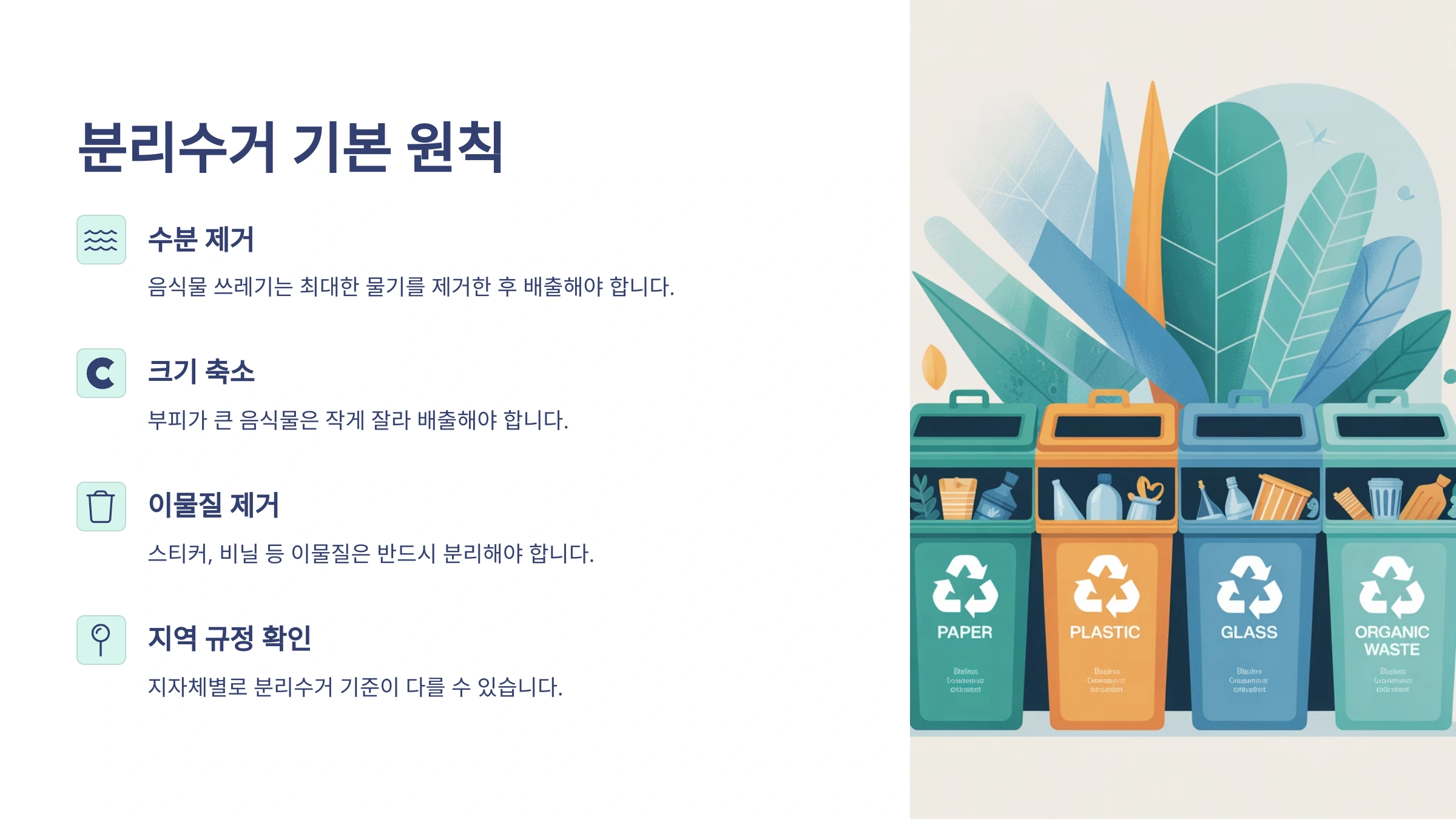 사실 음식물 쓰레기 분류, 그렇게 어렵지 않아요. 딱 한 가지 기준만 기억하면 웬만한 건 다 구분할 수 있습니다. 바로 "동물의 사료로 사용할 수 있는가?"입니다. 우리나라에서는 음식물 쓰레기를 주로 동물의 사료로 재활용하기 때문에, 동물이 먹기 힘든 것들은 일반 쓰레기로 버려야 해요.