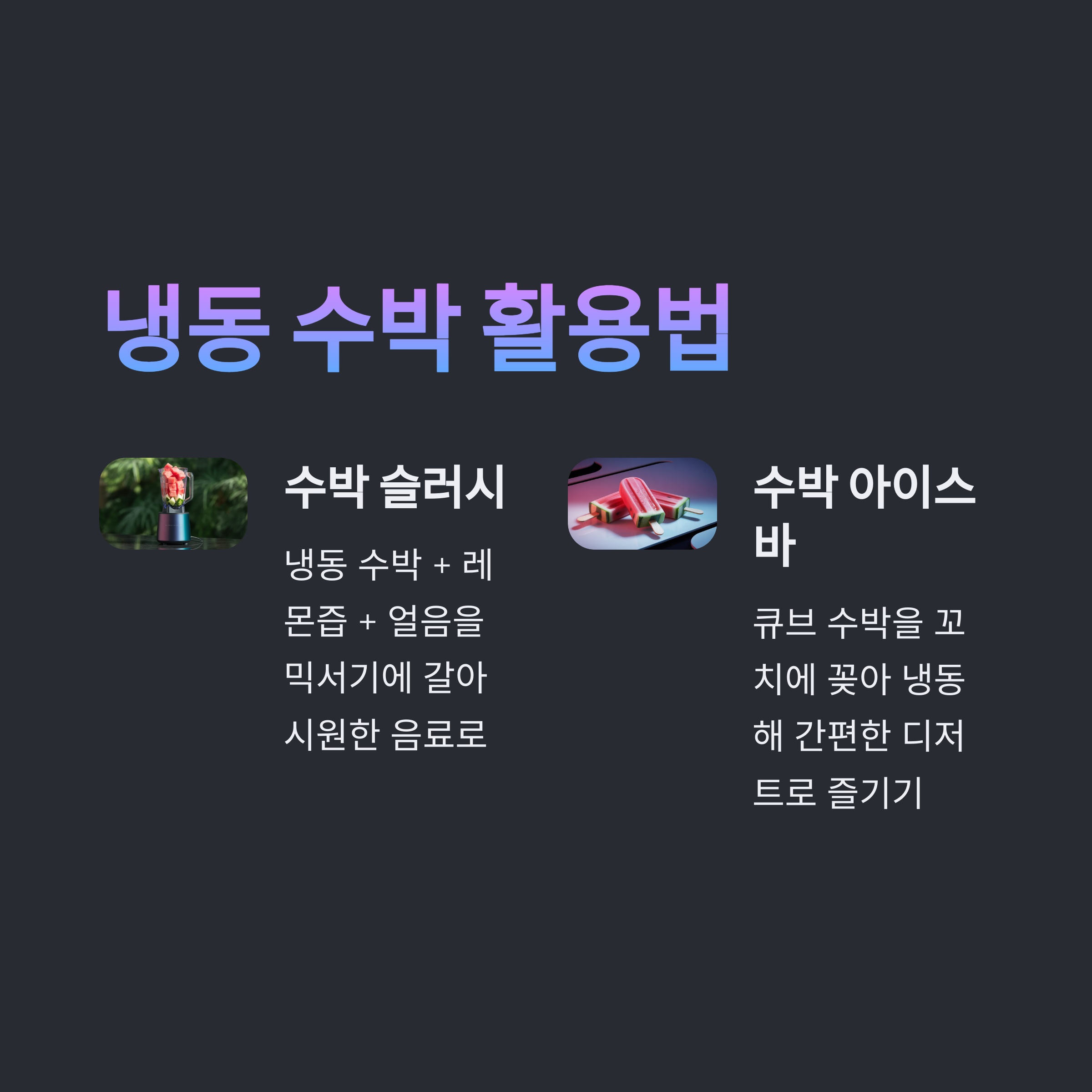 | 수박 탄산수 | 얼린 수박 조각을 탄산수에 넣어 청량한 음료로 즐기기 |
