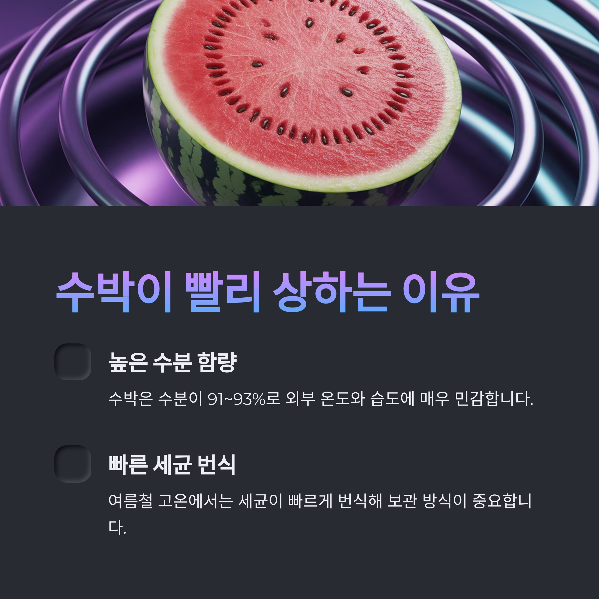 수박은 수분 함량이 91~93%에 달하는 과일로, 외부 온도나 습도에 민감합니다.