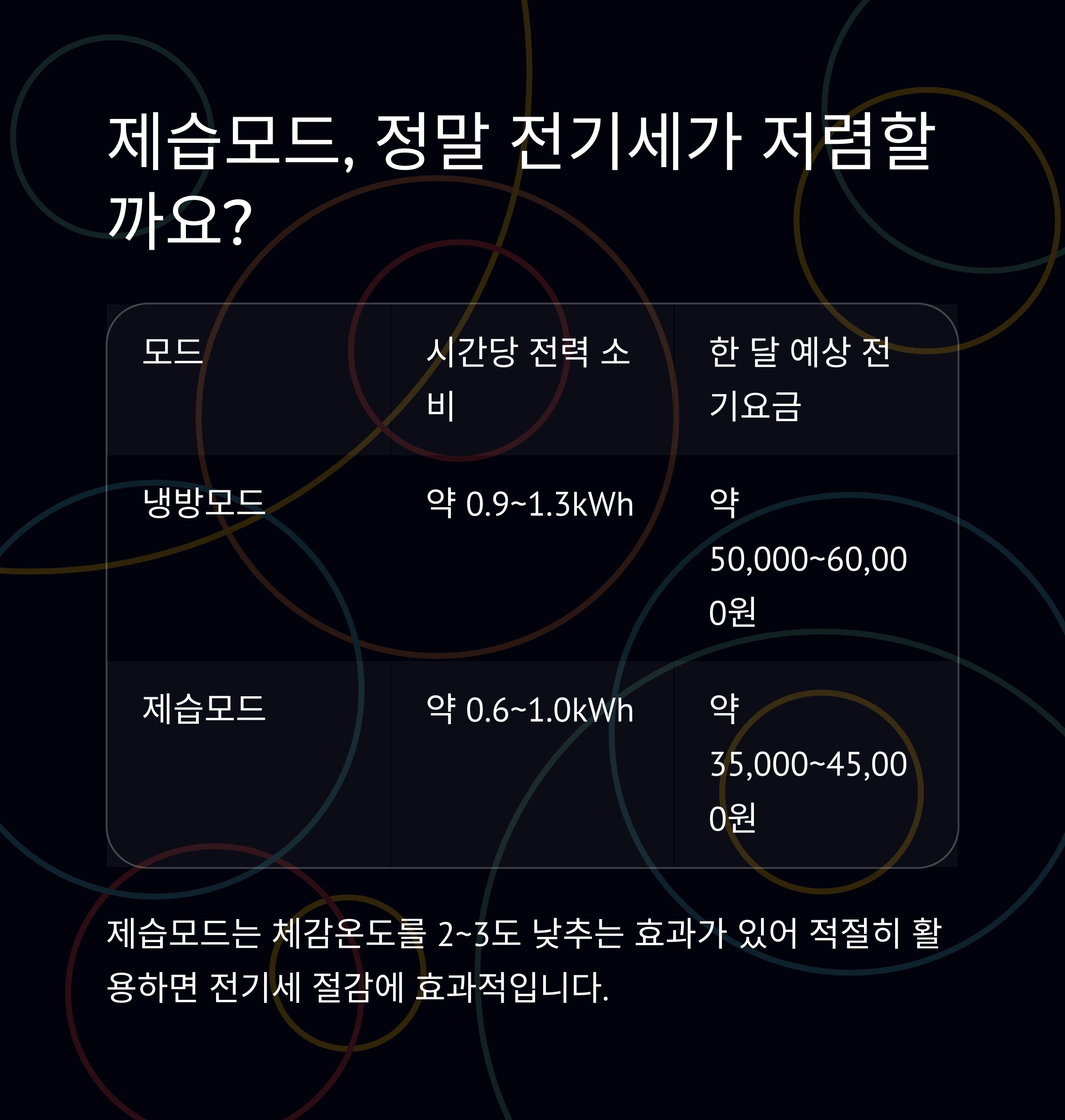 | 제습모드 | 약 0.6~1.0kWh | 약 35,000~45,000원 |