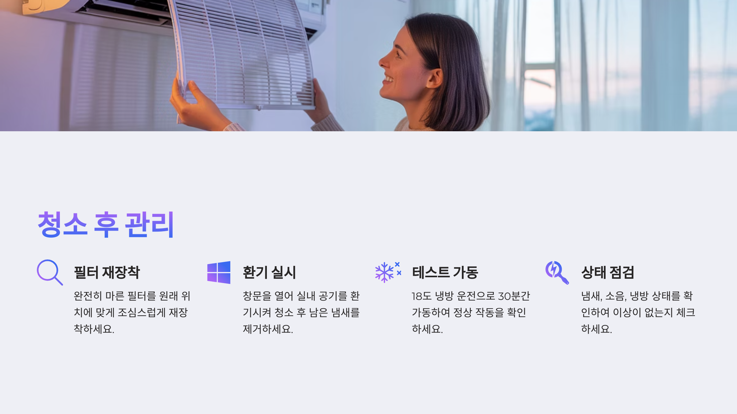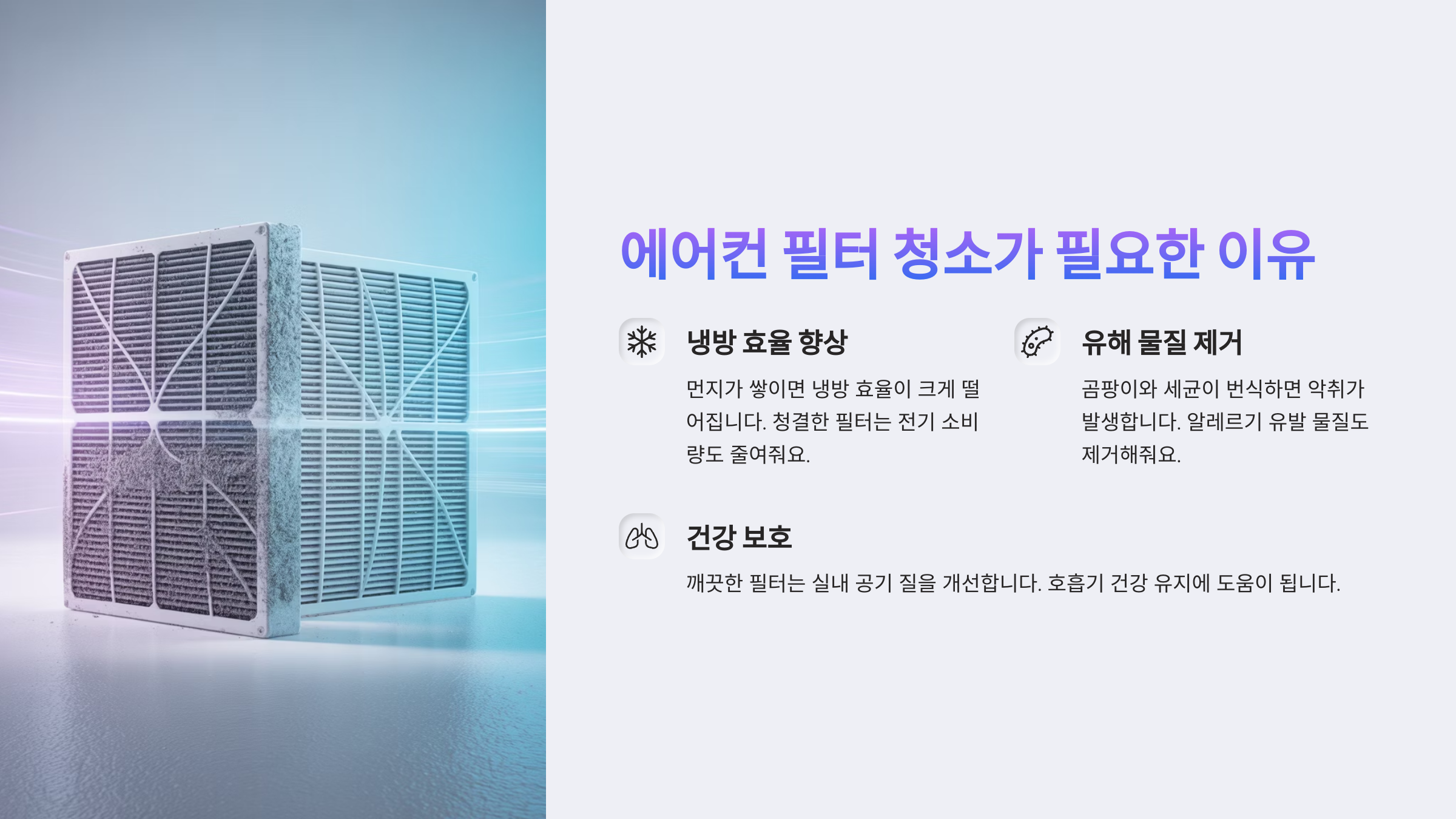 | 공기 상태 | 먼지·세균 포함 | 상쾌하고 깨끗함 |