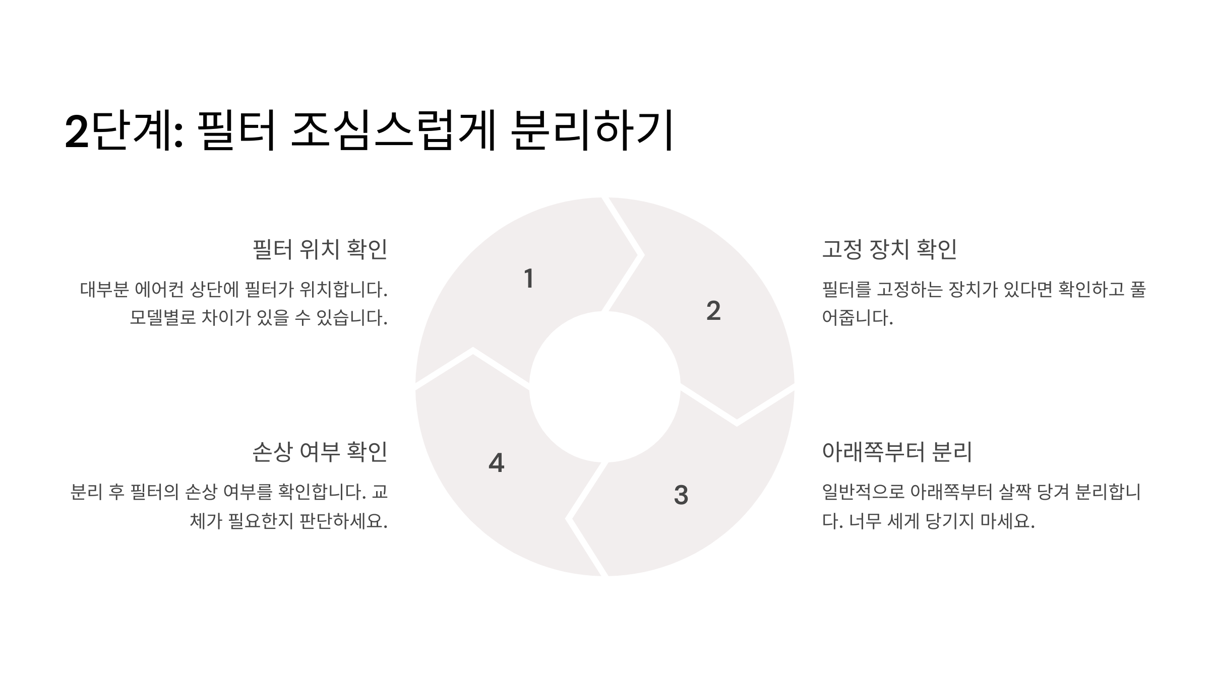 | 2단계 | 필터 분리 및 1차 먼지 제거 | 청소기 또는 솔 사용 |