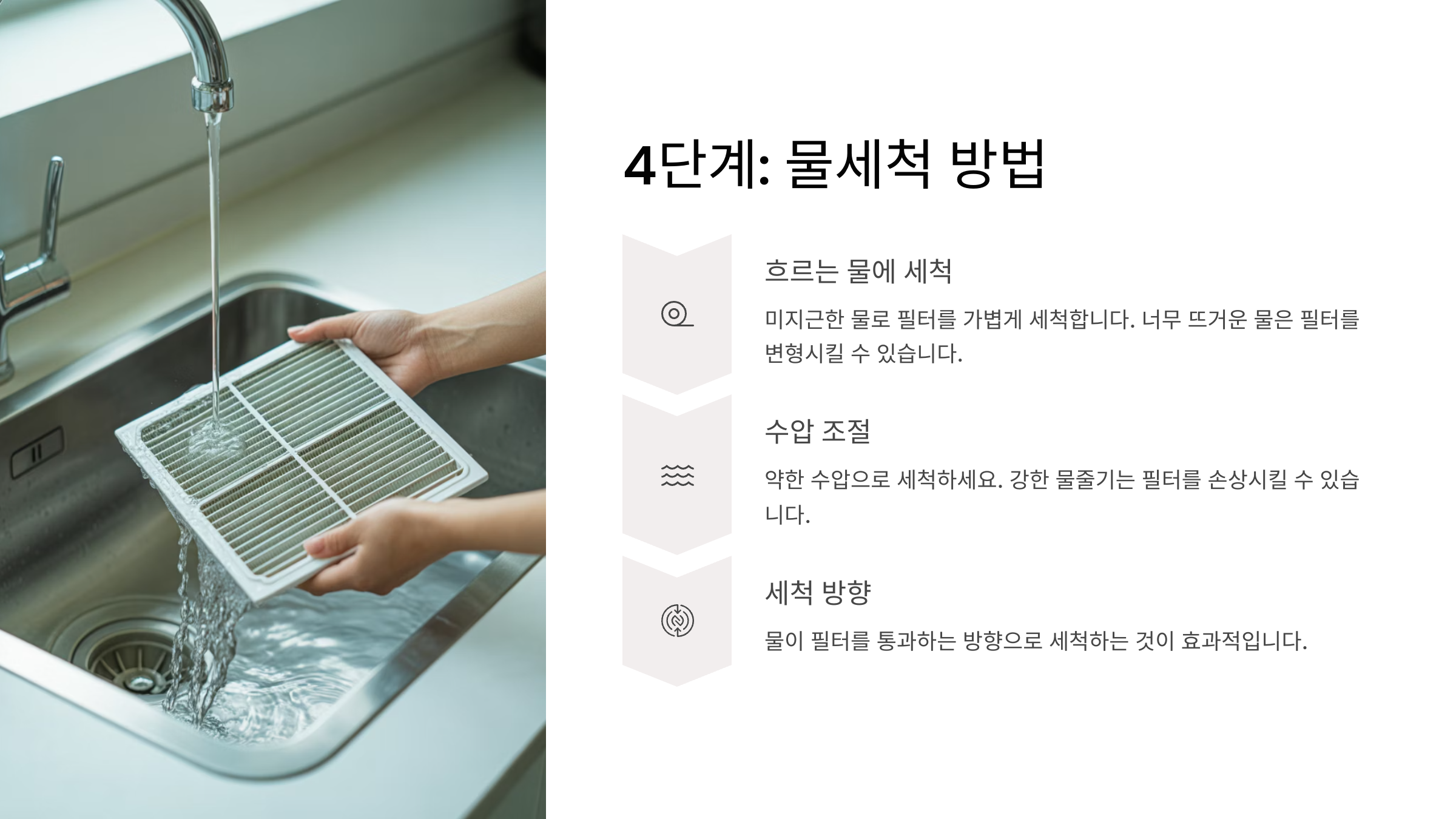 | 강한 세제 사용 | 필터 손상 | 중성세제만 사용 |