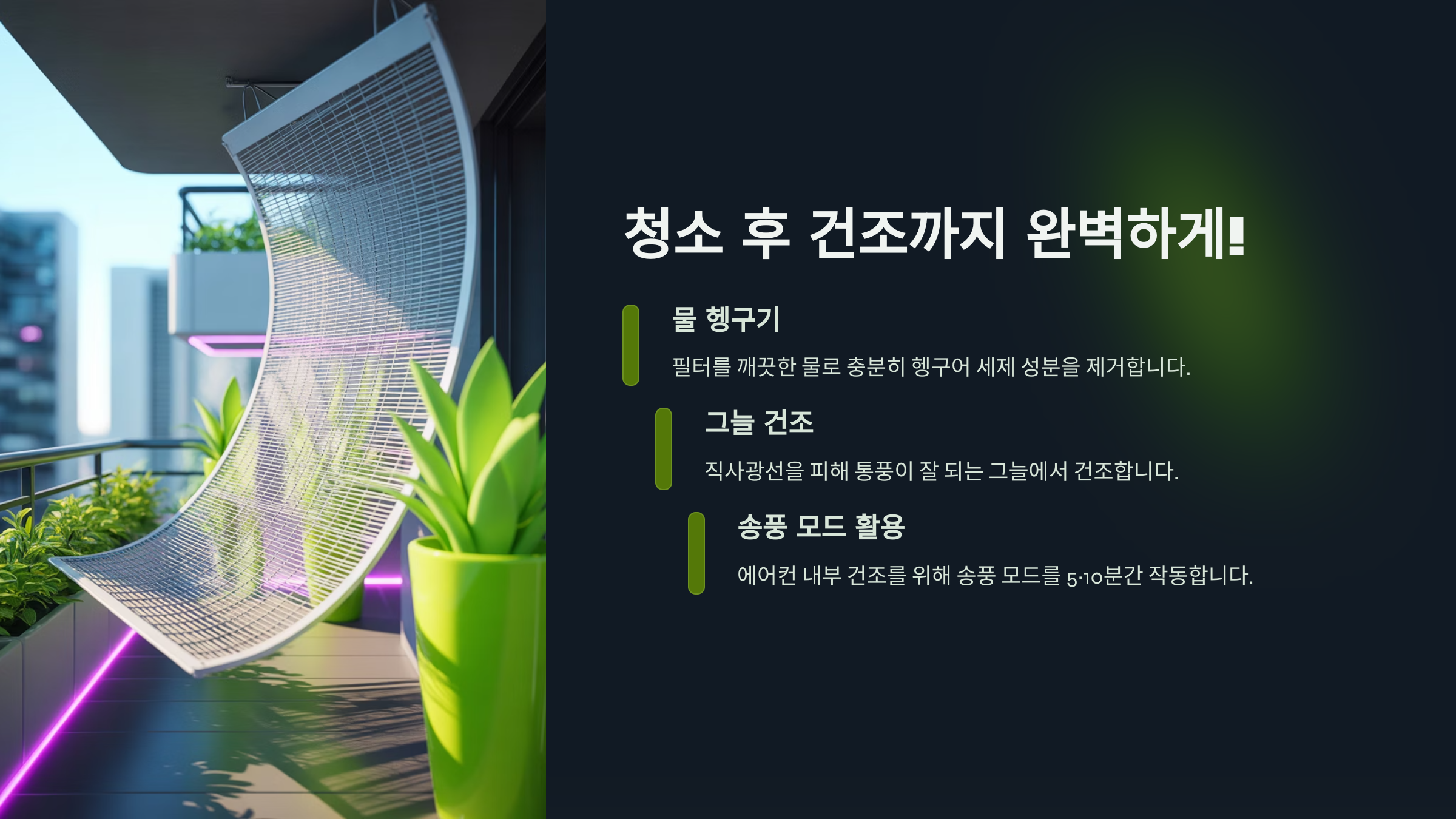 깨끗이 헹군 뒤에는 통풍이 잘 되는 곳에서 완전히 말려야 해요. 물기가 남아 있으면 에어컨 내부에서 곰팡이와 세균이 번식할 수 있기 때문에 자연건조는 필수예요! ☀️