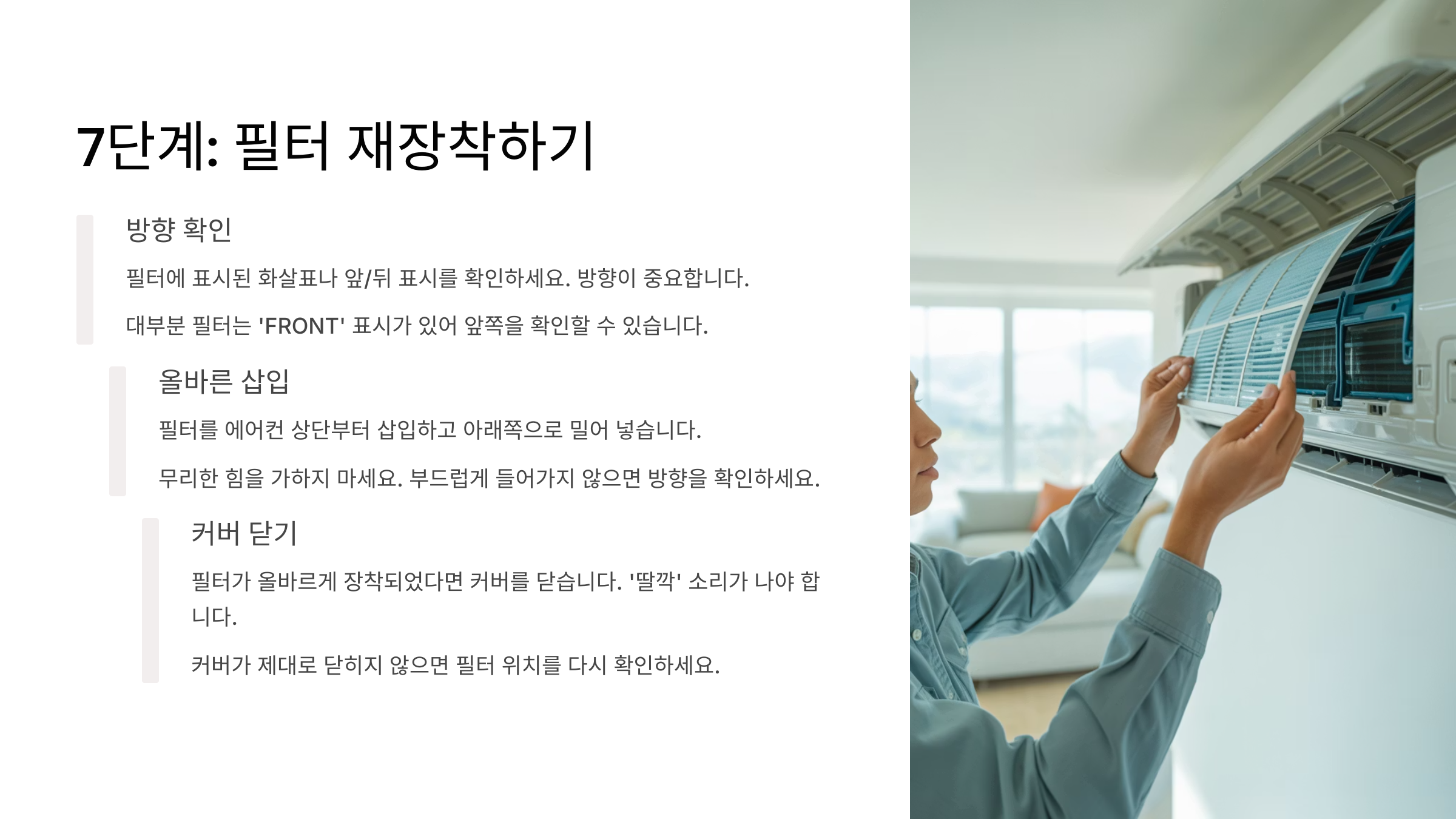 두 번째는 **필터 방향을 반대로 끼우는 실수**예요. 필터엔 대부분 공기 흐름 방향이 표시돼 있으니 꼭 확인하고 장착해야 해요. 반대로 끼우면 공기 흐름이 막혀서 에어컨 성능이 확 떨어져요.
