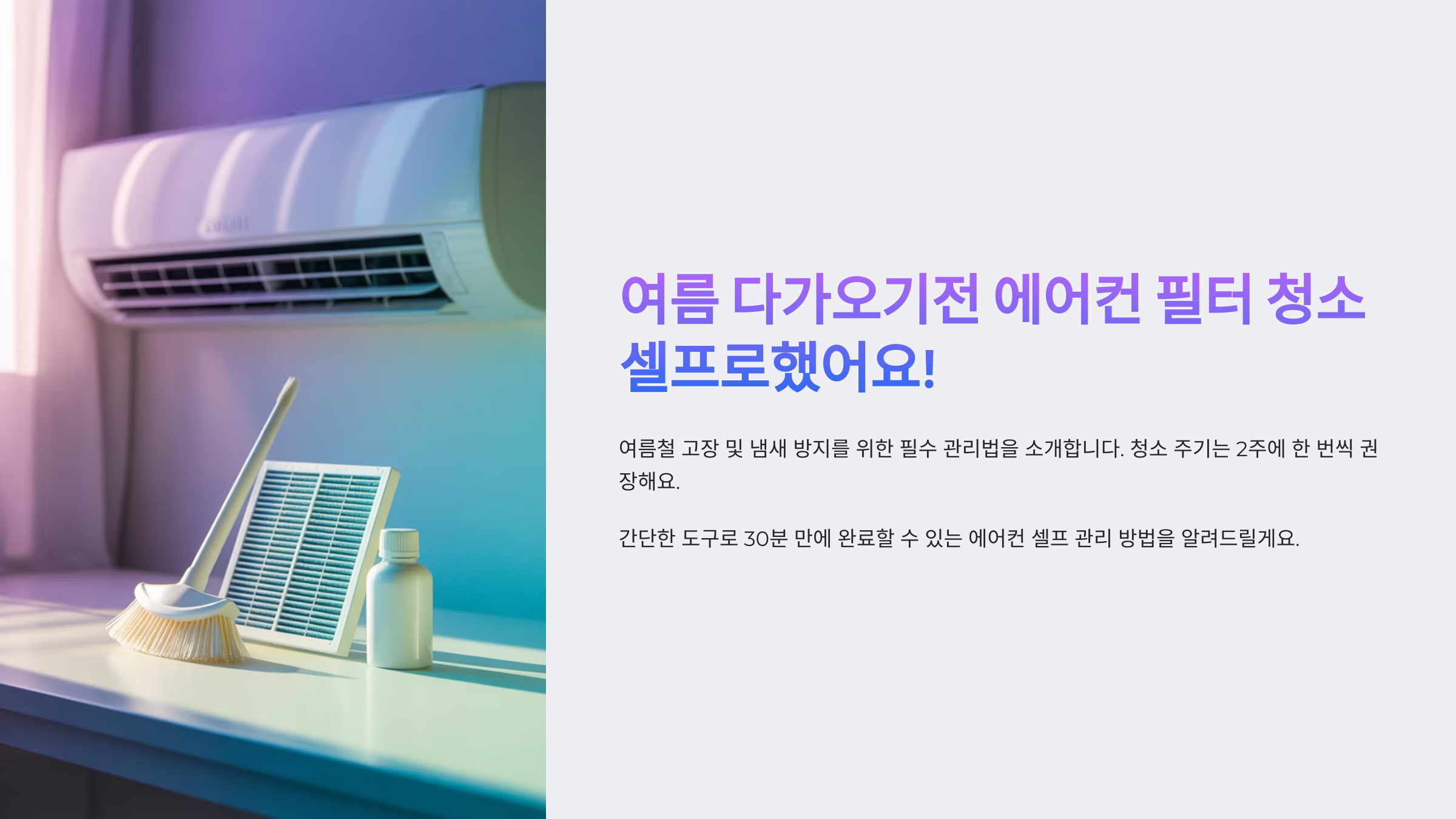 딱 20~30분만 투자하면, 에어컨 바람이 확 달라지는 걸 느낄 수 있어요. 셀프 청소로도 충분히 깨끗하게 관리할 수 있으니 여름 시작 전에 꼭 한 번 해보세요! 💨