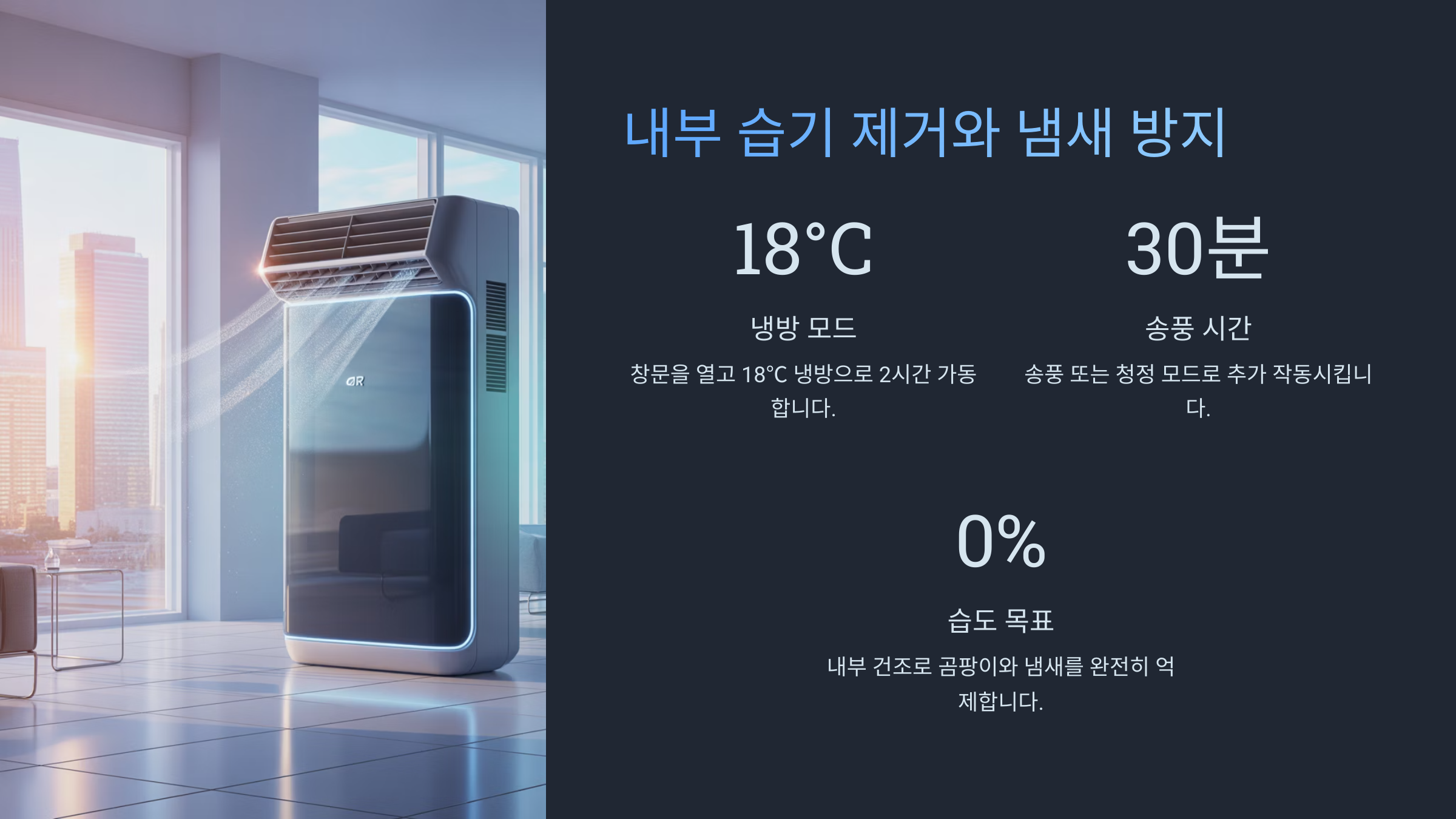 - 셀프 해결 3단계: 필터 청소 → 냉각핀 청소 → 내부 건조 (송풍). 잊지 마세요!
