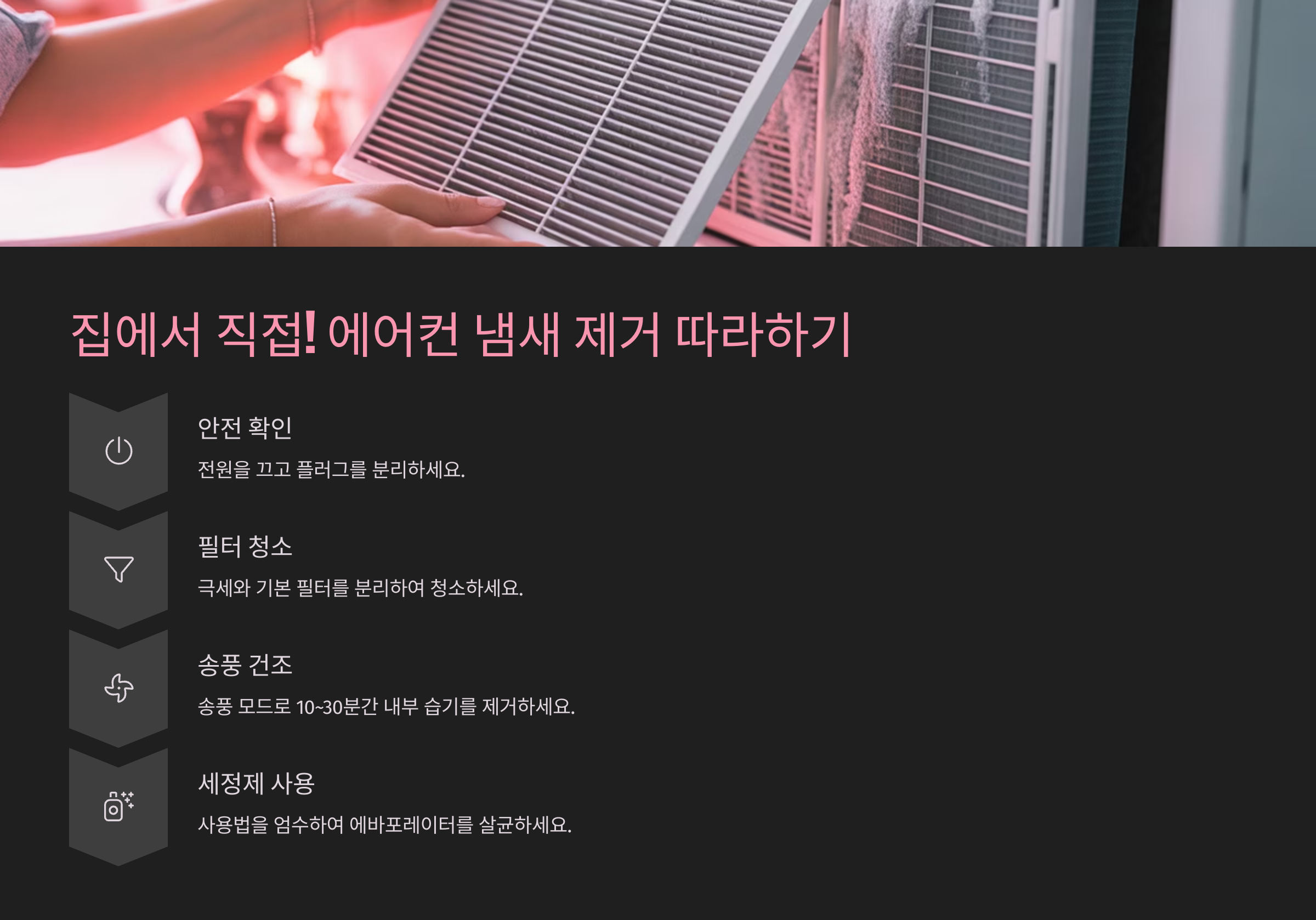 - 셀프 해결 3단계: 필터 청소 → 냉각핀 청소 → 내부 건조 (송풍). 잊지 마세요!