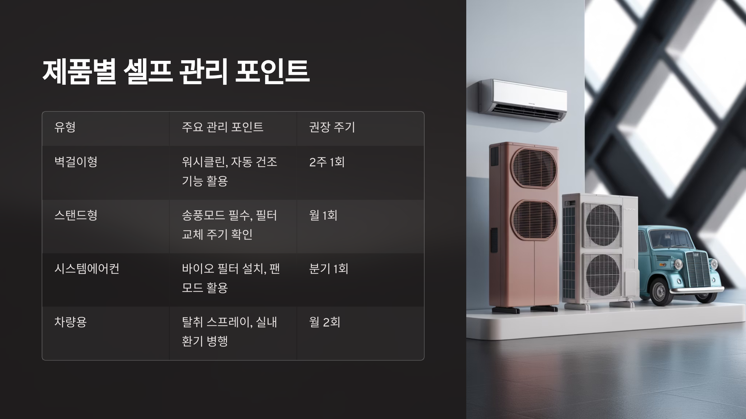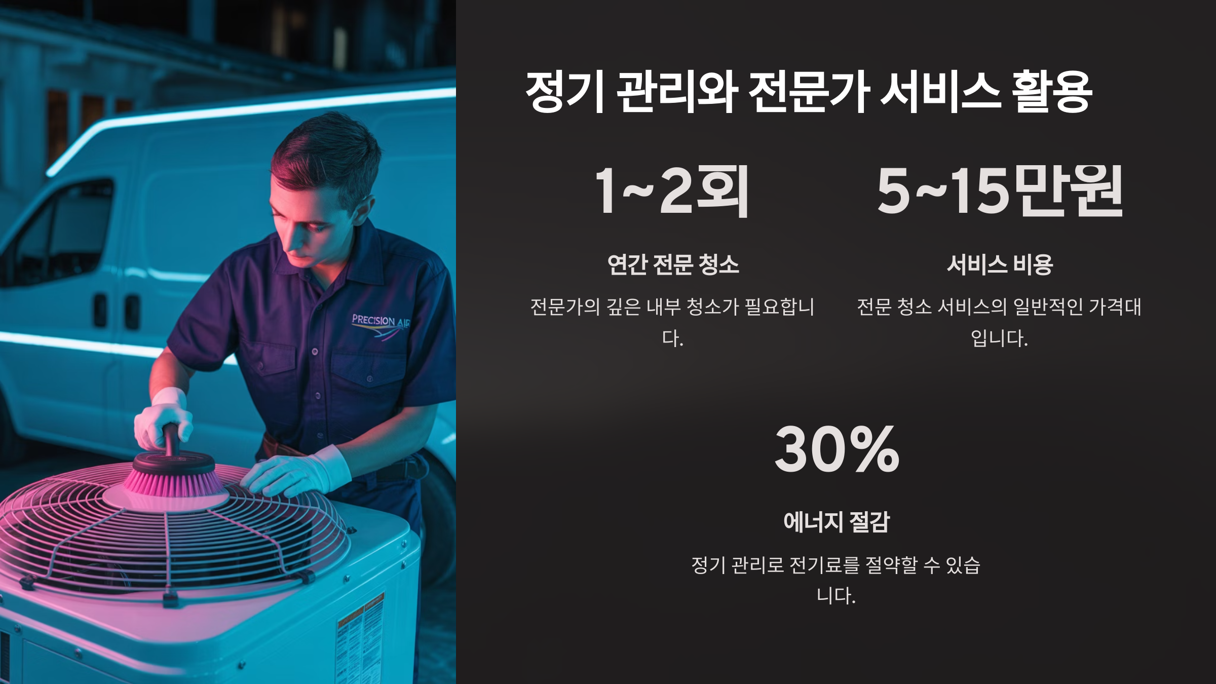 | 냉각핀 청소 (셀프) | 계절 시작 전/후 (또는 필요시) | 전용 세정제 사용, 환기 필수 |
