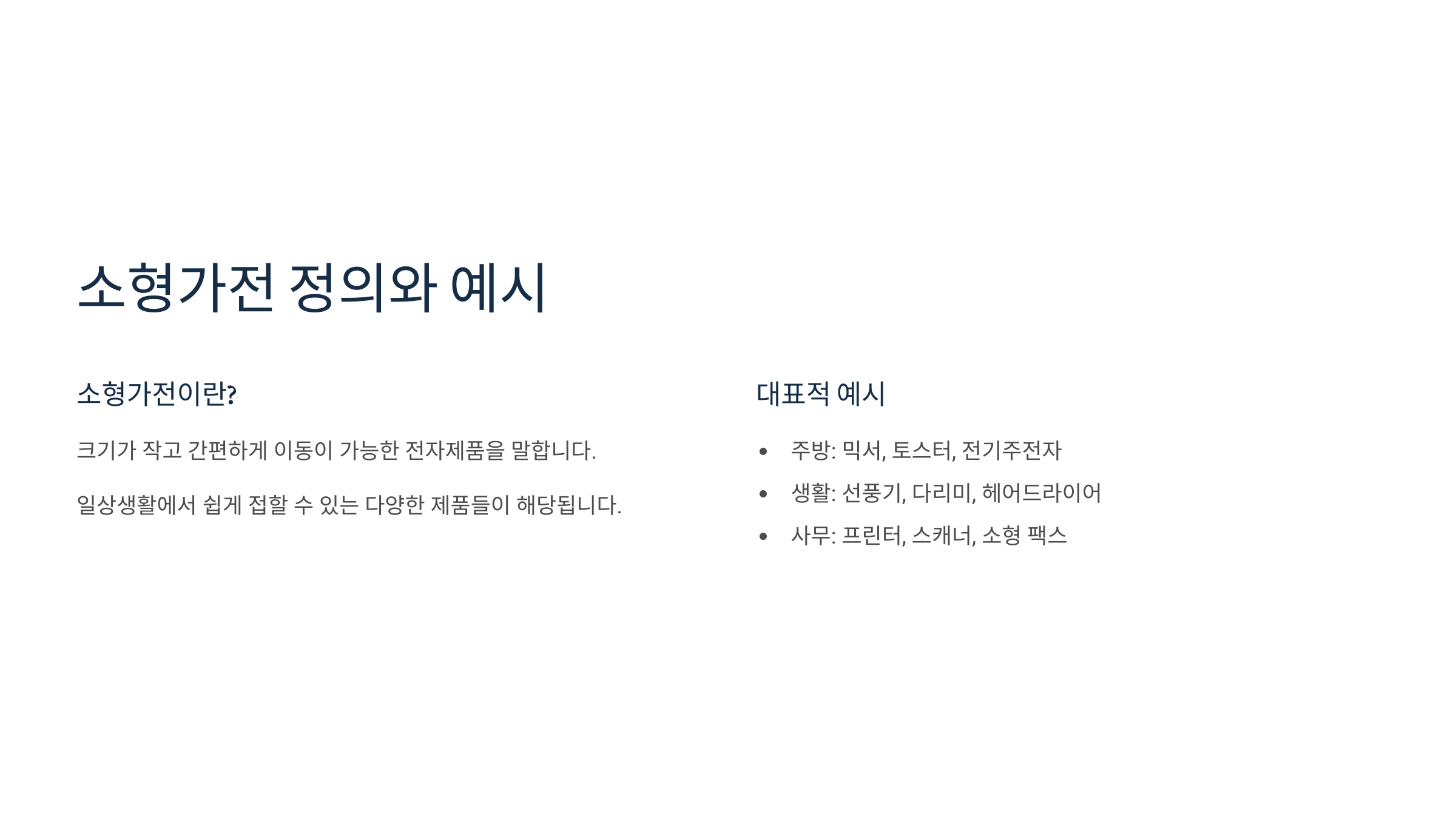우리가 흔히 '소형가전'이라고 부르는 것들은 생각보다 종류가 다양해요. 법적으로는 높이 1m 미만의 가전제품을 의미하는데요, 쉽게 말해 전기밥솥, 믹서기, 전자레인지, 선풍기, 청소기, 헤어드라이어, 다리미, 노트북, 프린터 등이 모두 여기에 해당돼요.