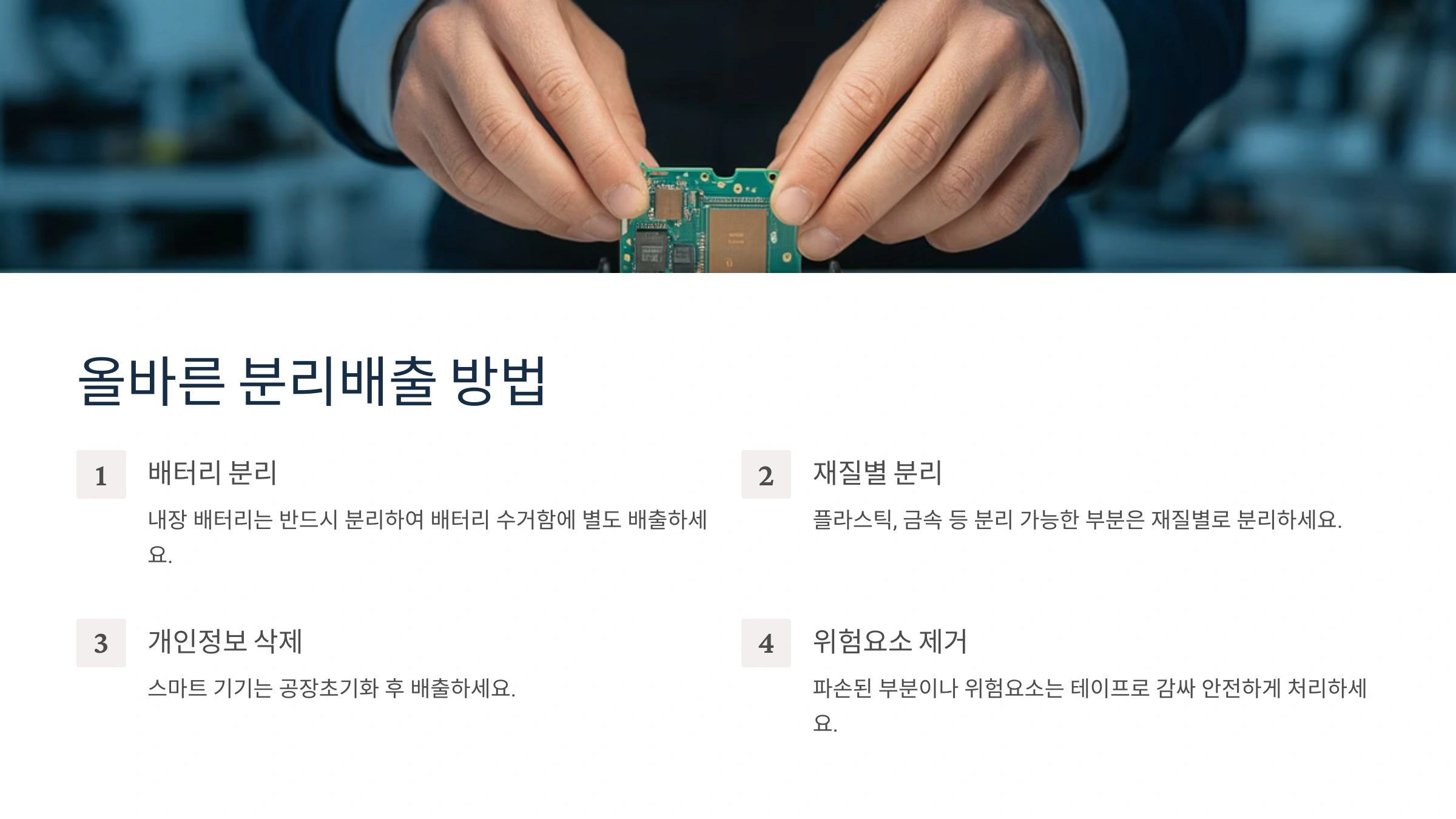 - 배터리 분리: 리모컨, 시계 등 건전지가 들어가는 제품은 배터리를 분리해서 별도의 폐건전지 수거함에 버려주세요. 부풀어 오르거나 손상된 리튬이온배터리는 화재 위험이 있으니 특히 주의해야 합니다.
