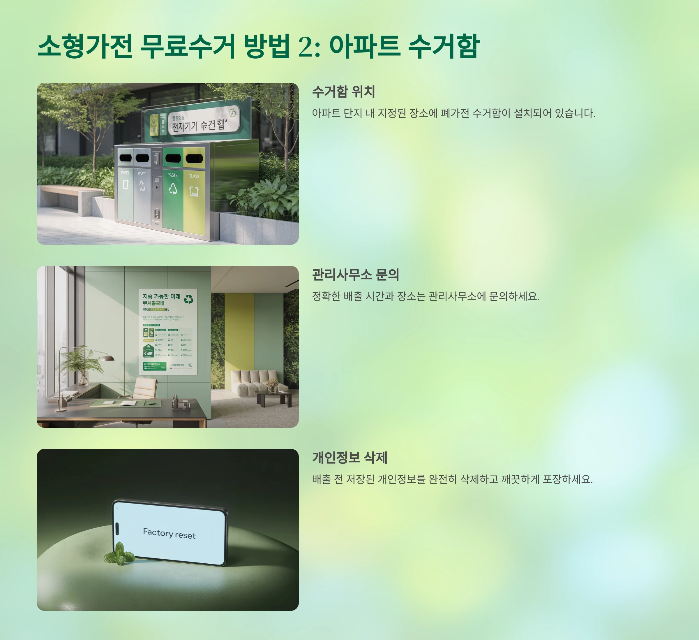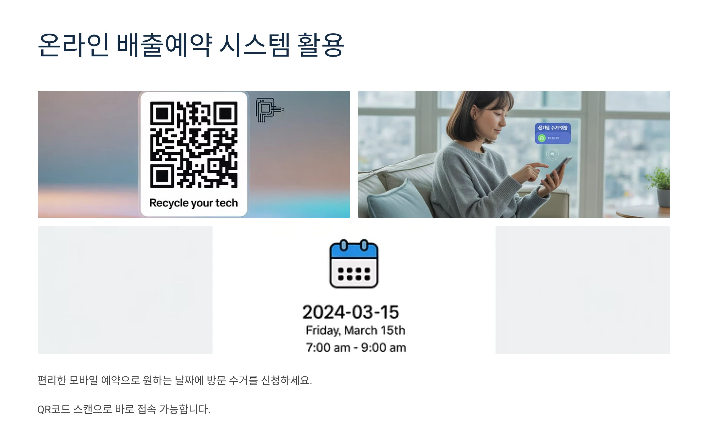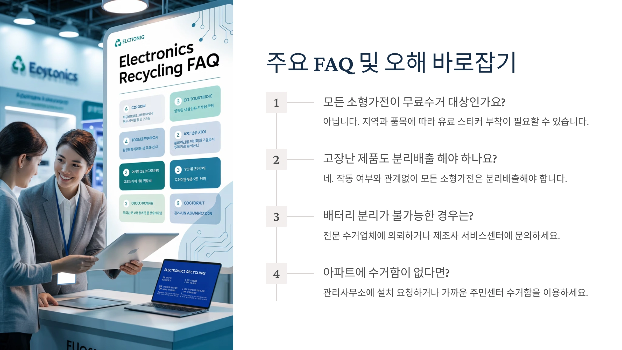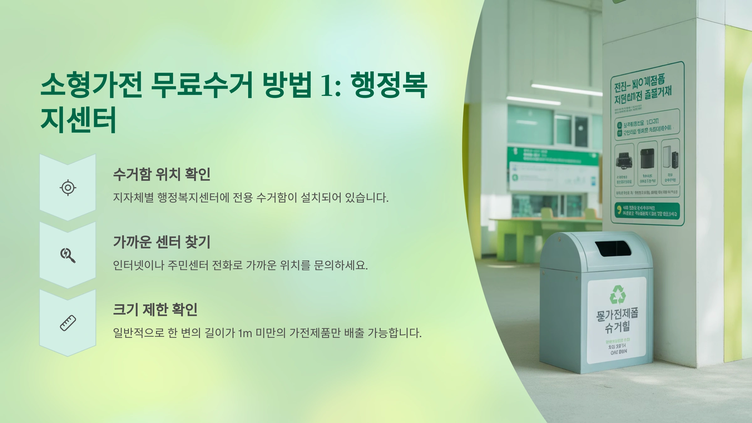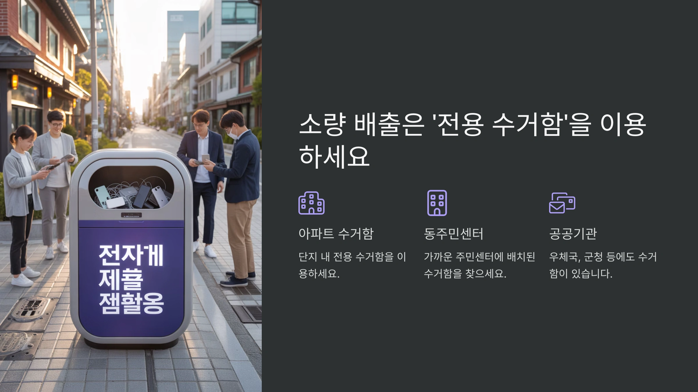 - 주의사항: 수거함이 넘치지 않도록 차곡차곡 넣어주고, 가전제품 외의 쓰레기는 절대 넣지 않는 성숙한 시민 의식이 필요해요!