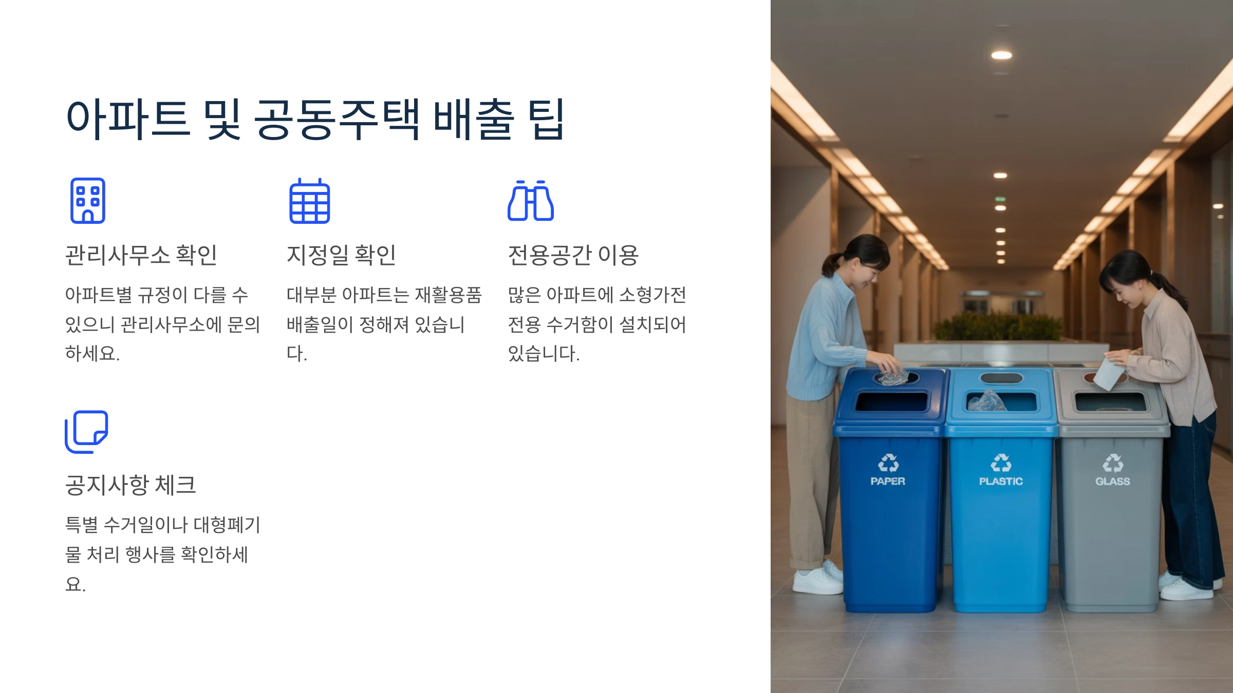 - 수거함 위치: 아파트 분리수거장, 주택가 거점 수거장, 주민센터 등