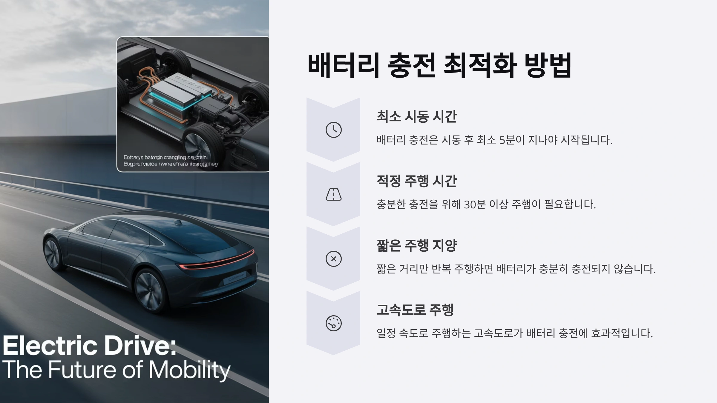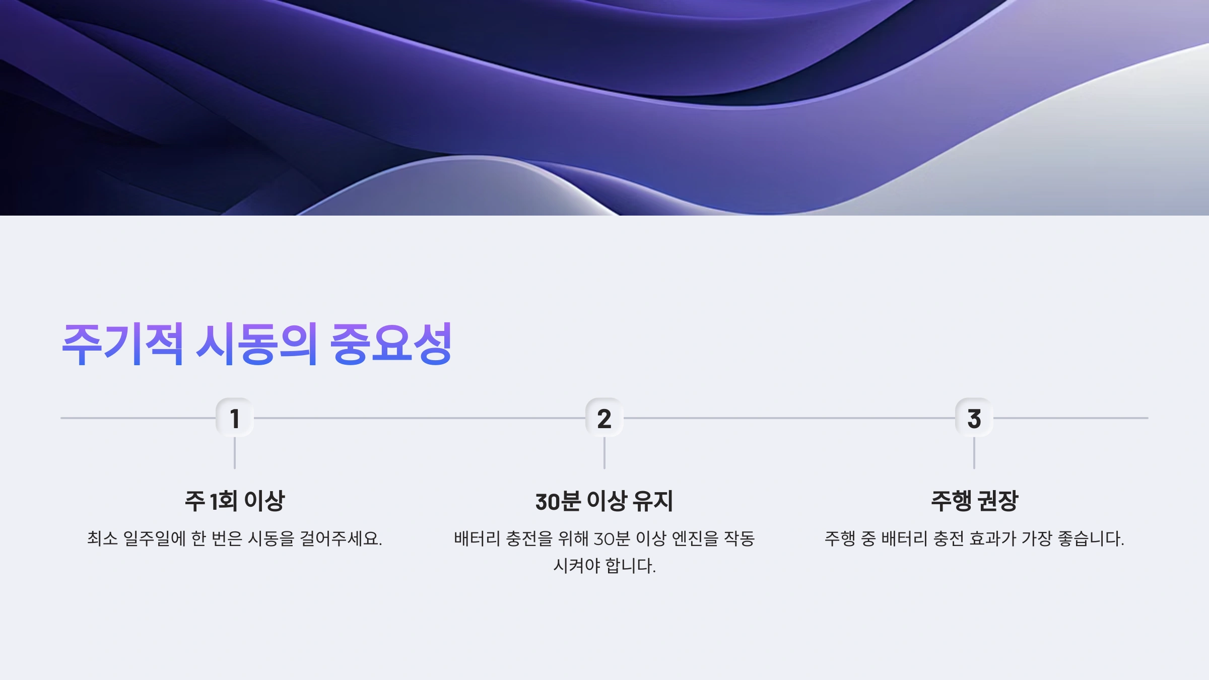 | ✔ 주기적인 장거리 운전 | ❌ 잦은 단거리 운행 반복 |