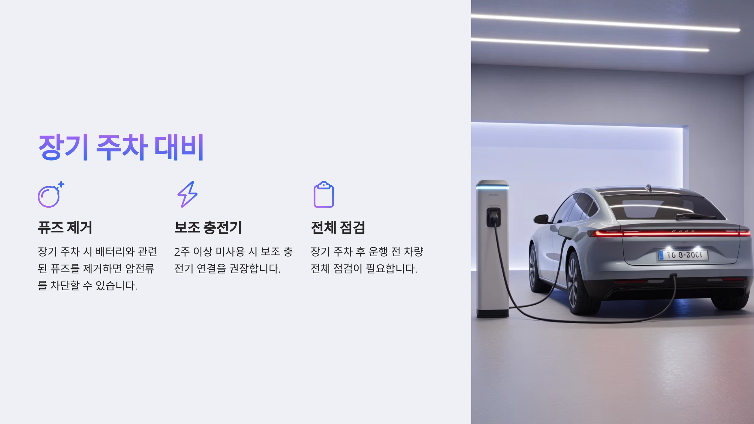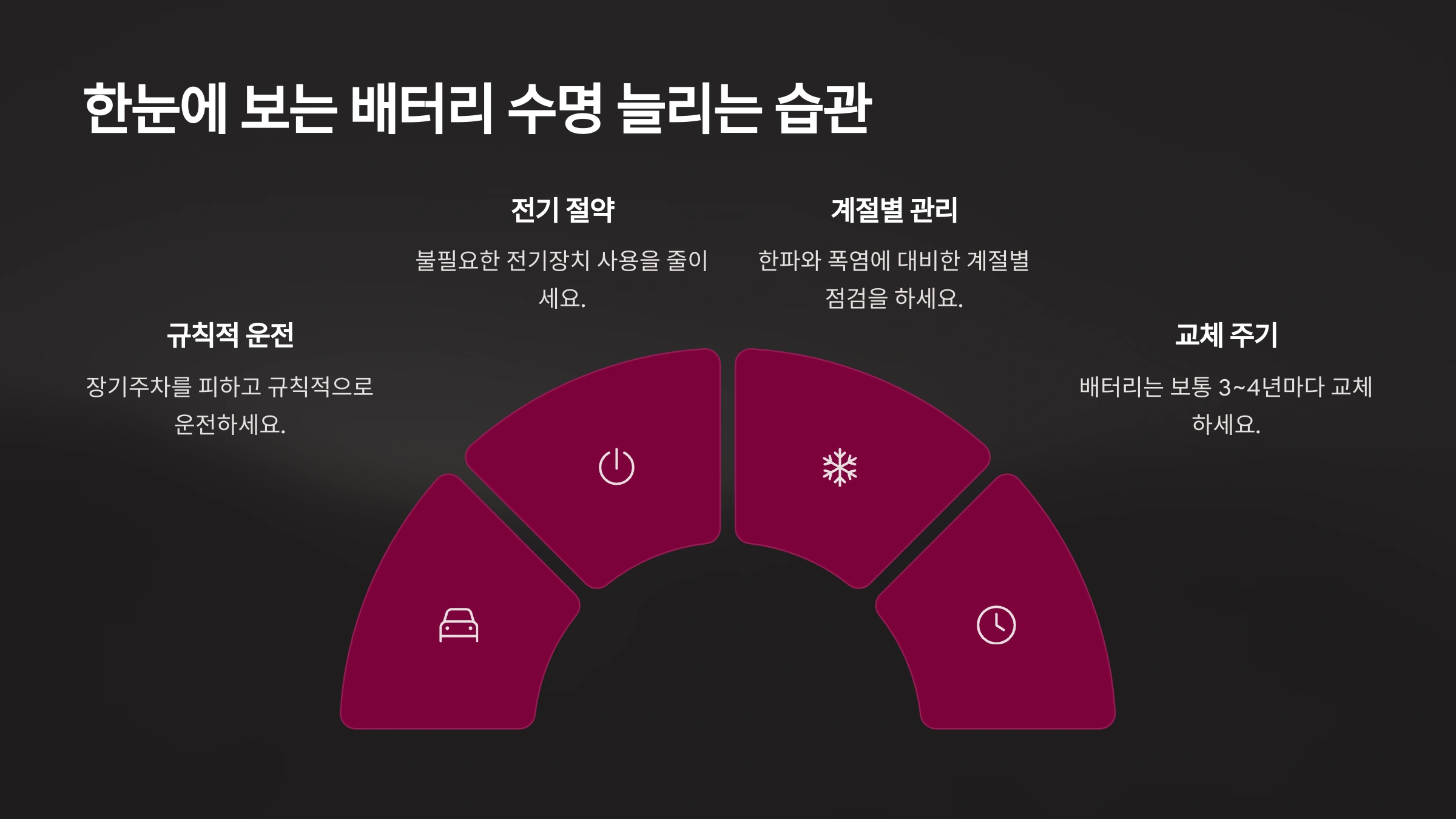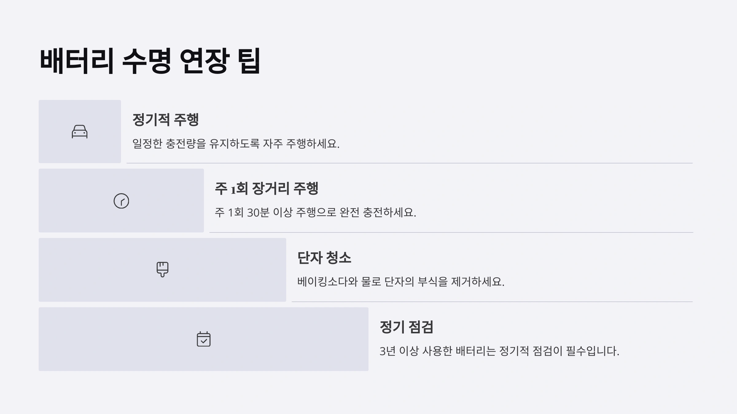 - 주 1회, 30분 이상 운행하기: 배터리를 충분히 충전시키기 위한 가장 좋은 방법입니다. 목적지 없이 드라이브를 하는 것이 부담스럽다면, 마트에 가거나 주말에 외출할 때 일부러 조금 더 먼 길로 돌아오는 것도 좋은 습관이에요.