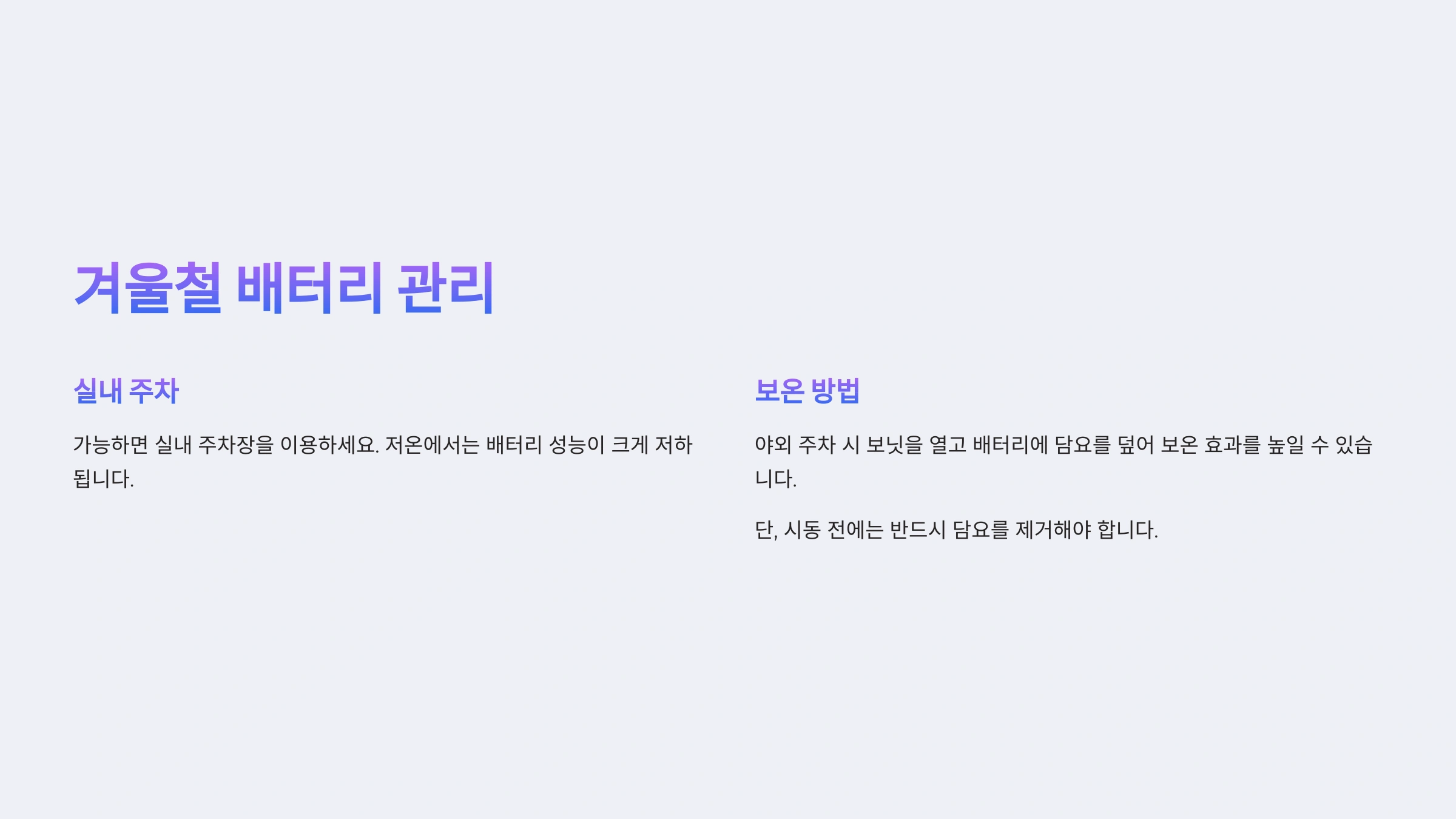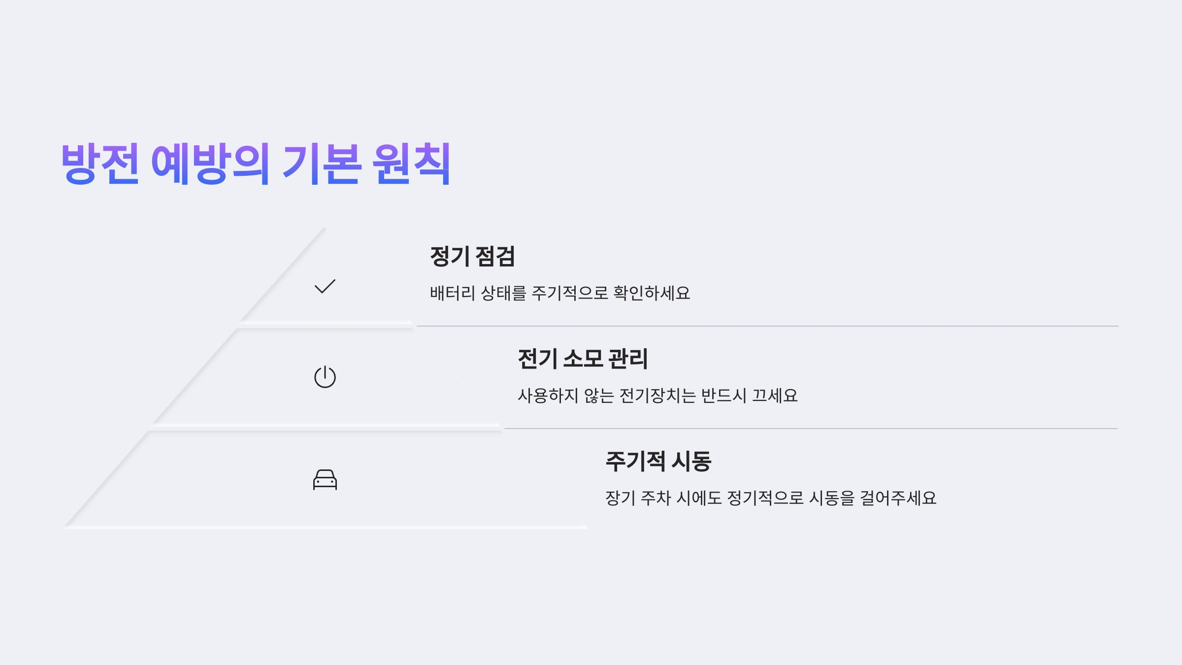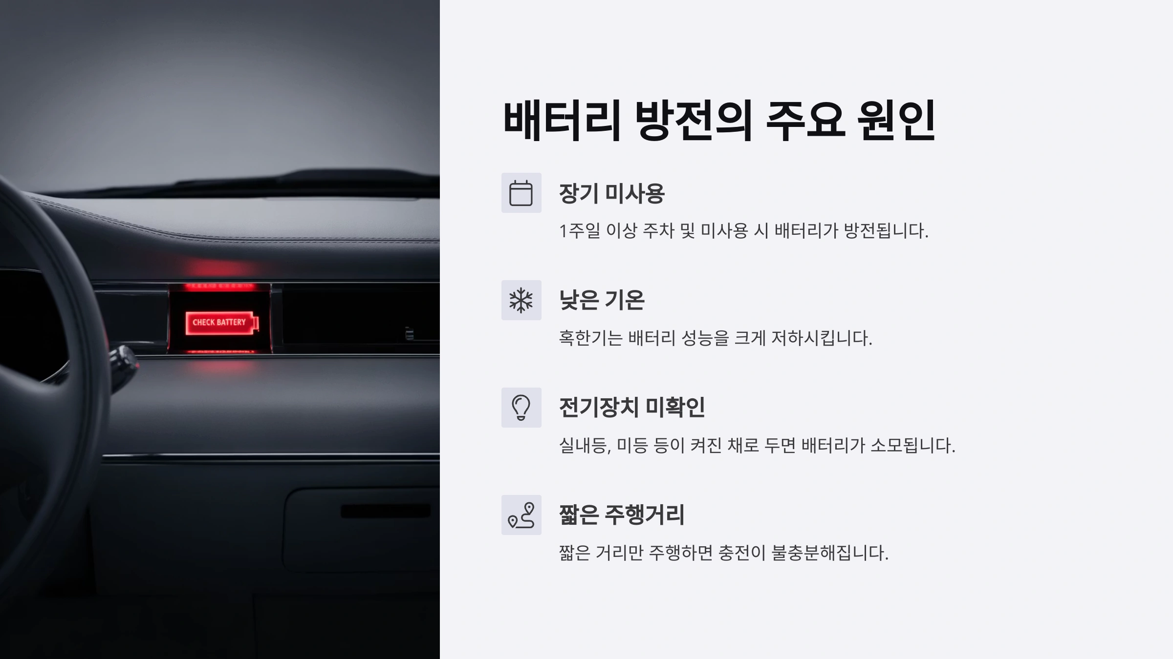 - 주 1회, 30분 이상 운행하기: 배터리를 충분히 충전시키기 위한 가장 좋은 방법입니다. 목적지 없이 드라이브를 하는 것이 부담스럽다면, 마트에 가거나 주말에 외출할 때 일부러 조금 더 먼 길로 돌아오는 것도 좋은 습관이에요.