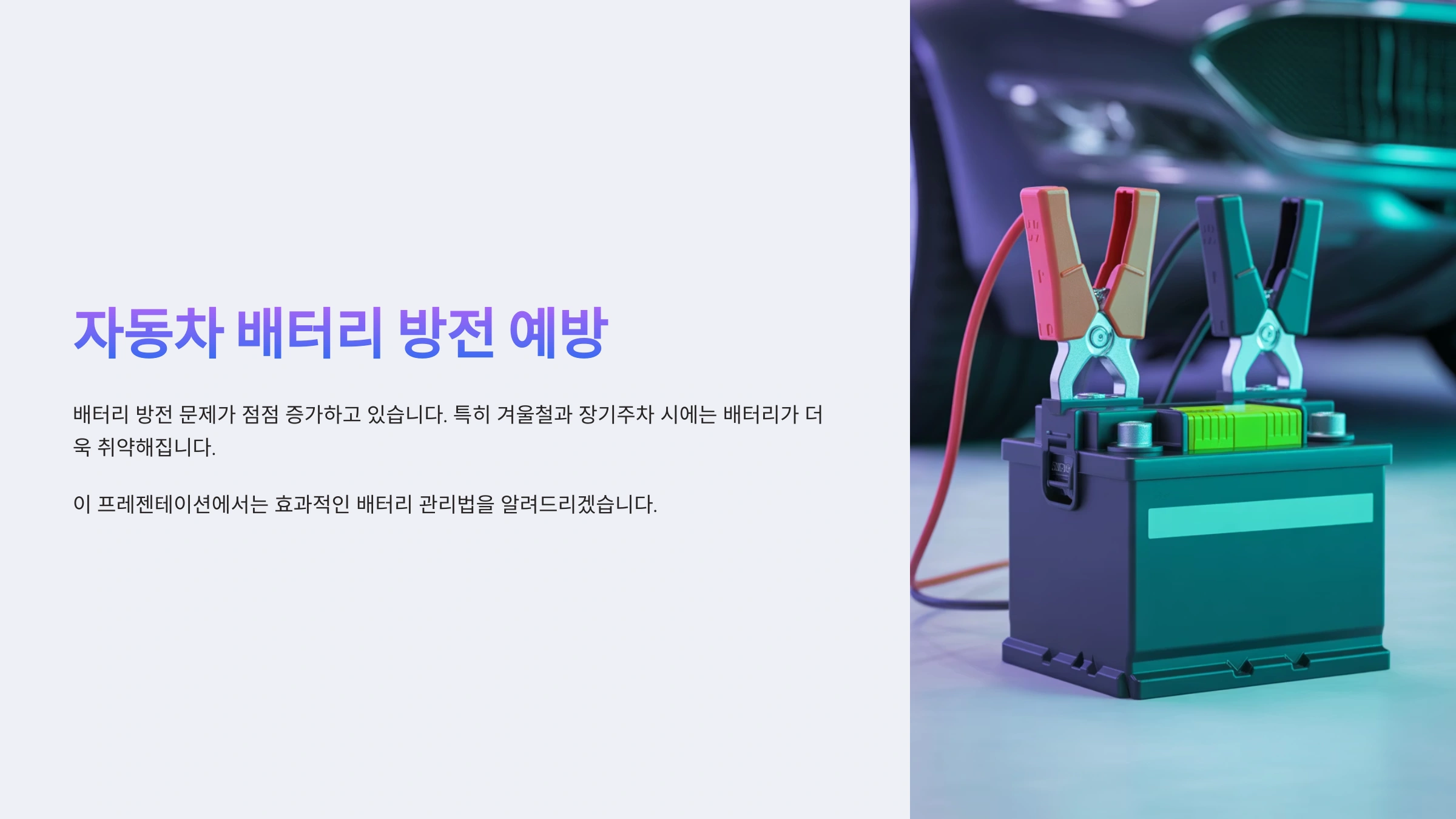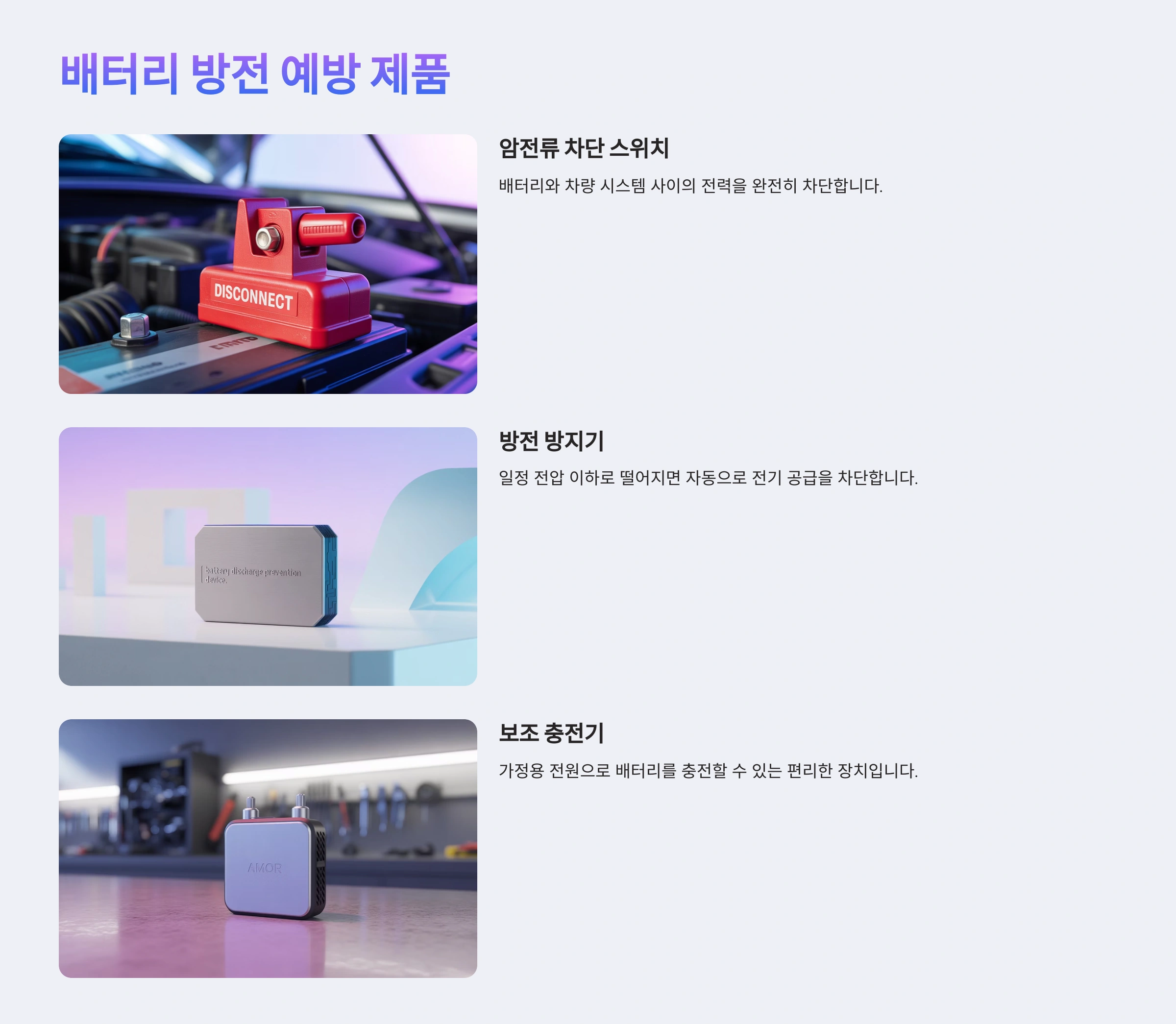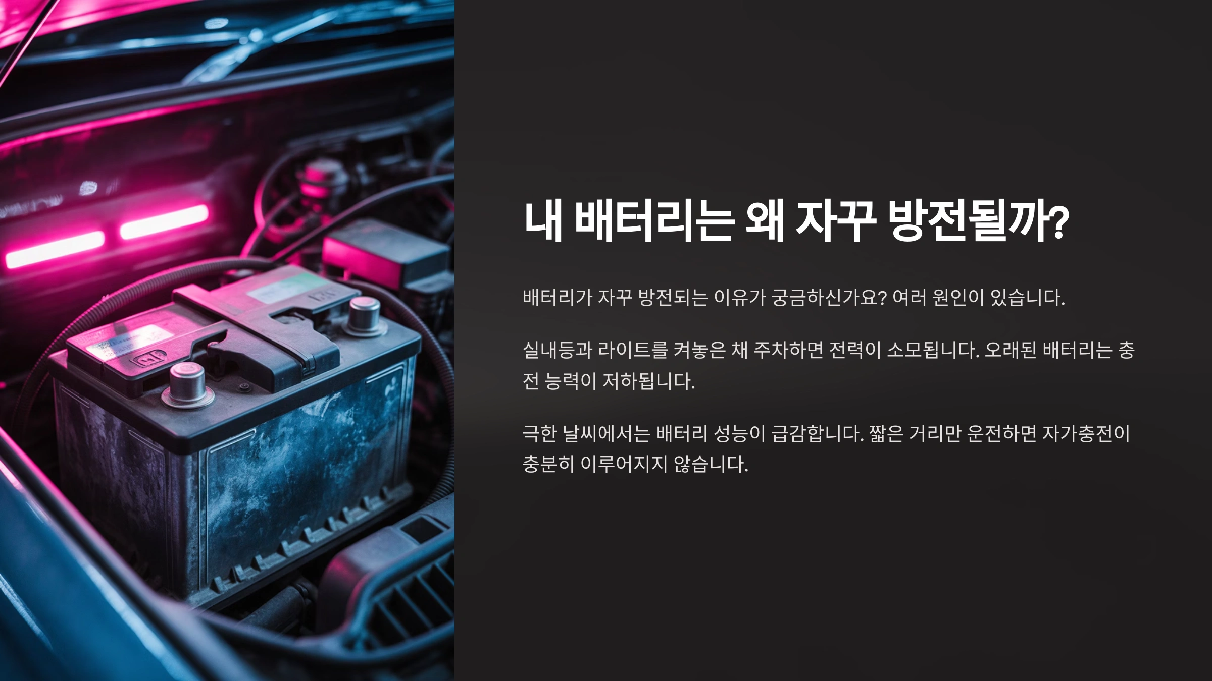 "찰칵, 찰칵..." 힘없는 소리만 내뱉는 자동차만큼 아침부터 맥 빠지게 하는 게 또 있을까요? 😩 바쁜 출근길에 시동이 안 걸려서 발만 동동 굴렀던 경험, 저만 있는 거 아니죠? 자동차 배터리는 우리 차의 심장과도 같은데, 평소에는 잘 있는 듯하다가 결정적인 순간에 말썽을 부리곤 합니다. 특히 요즘처럼 블랙박스는 기본이고, 각종 전자기기 사용이 많은 차량일수록 배터리 방전은 숙명처럼 느껴지기도 하는데요.