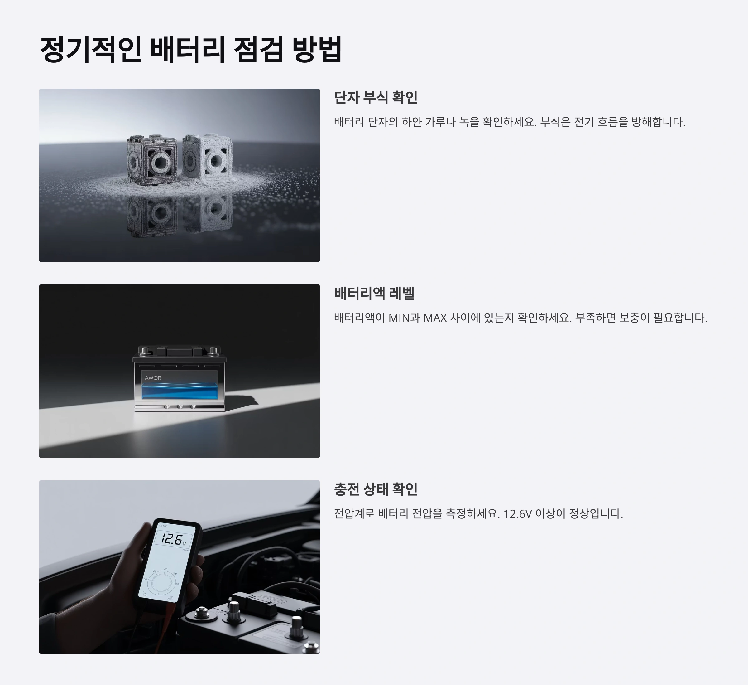 | ✔ 배터리 단자 청결 유지 | ❌ 추가 전자 장치 무분별하게 설치하기 |