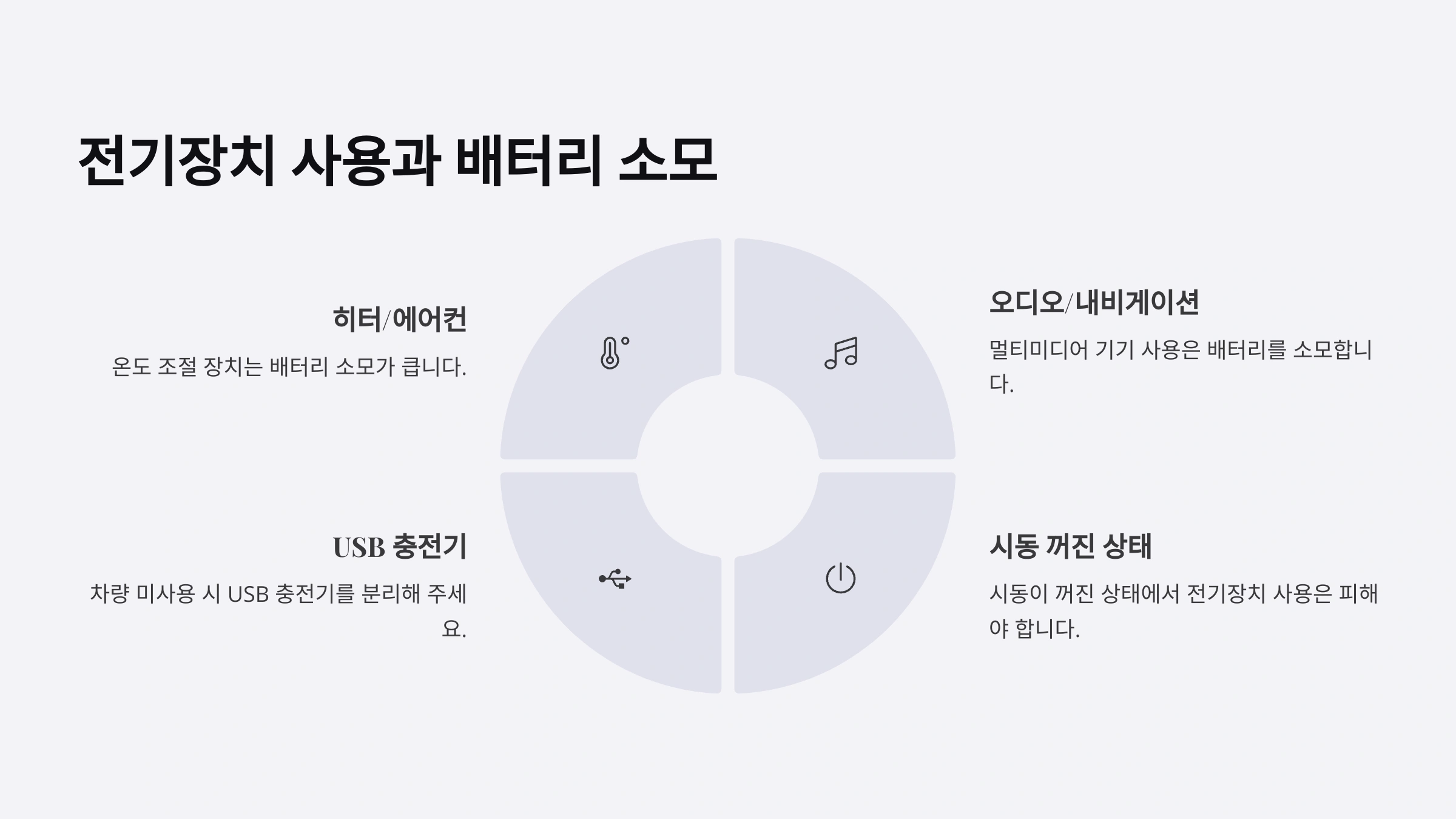 | ✔ 주차 후 전자기기 전원 확인 | ❌ 시동 끈 상태에서 장시간 오디오/DMB 사용 |