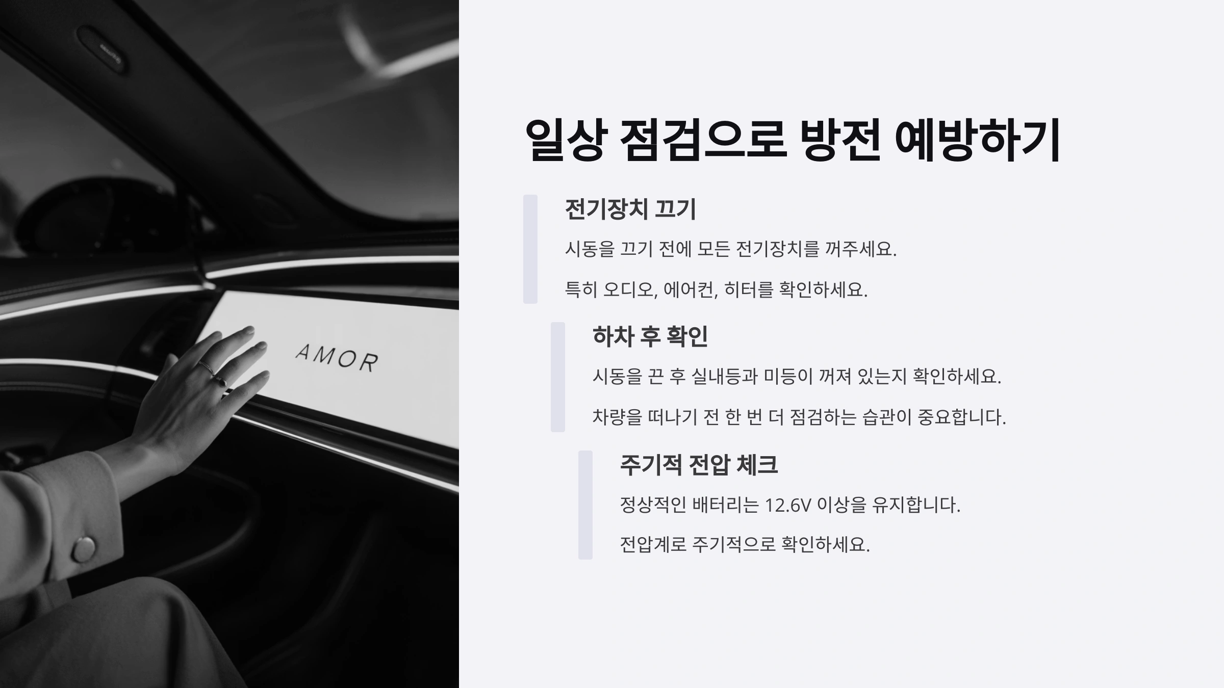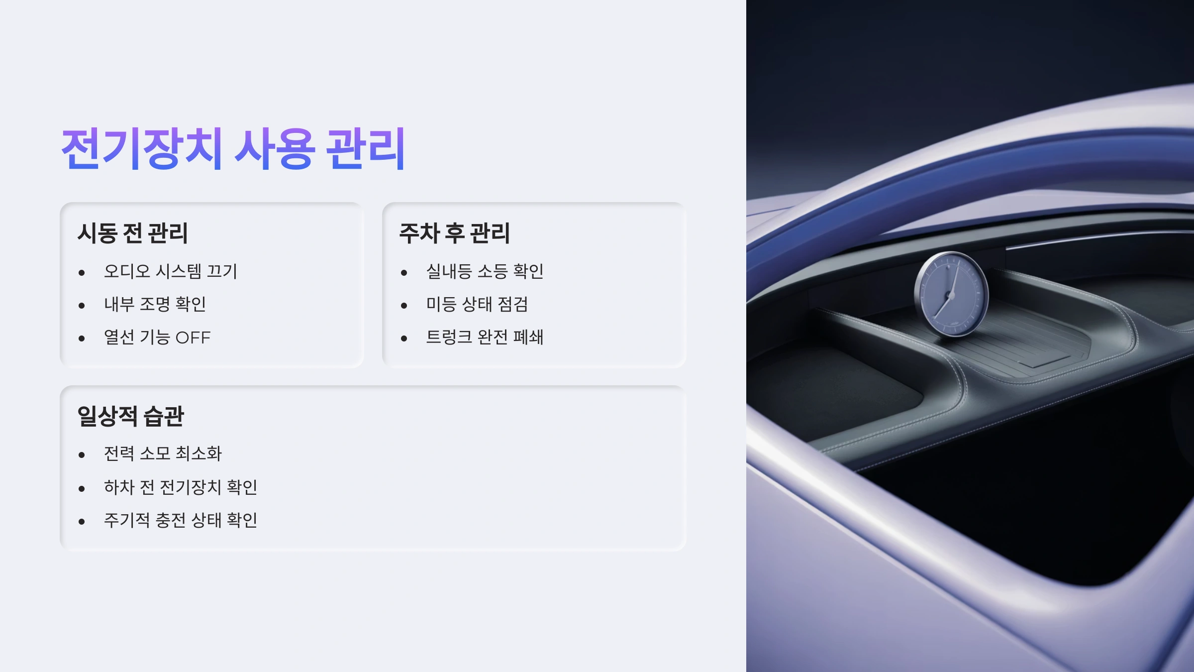 - 주차 후 전자기기 전원 확인: 차에서 내리기 전, 실내등, 전조등, 오디오 등 모든 전자기기의 전원이 꺼졌는지 다시 한번 확인하는 습관을 들이세요. 간단하지만 효과는 확실합니다.