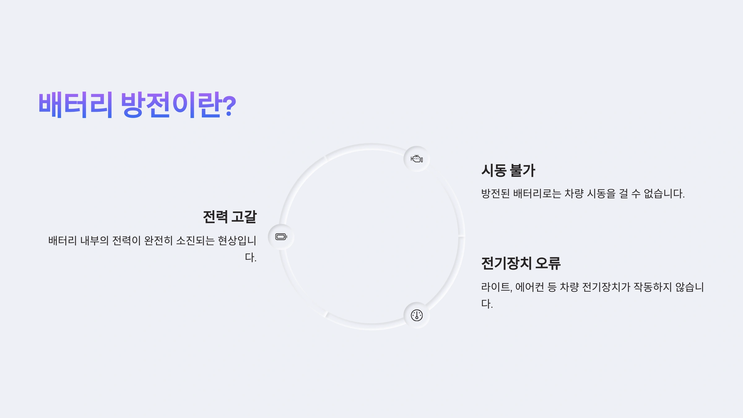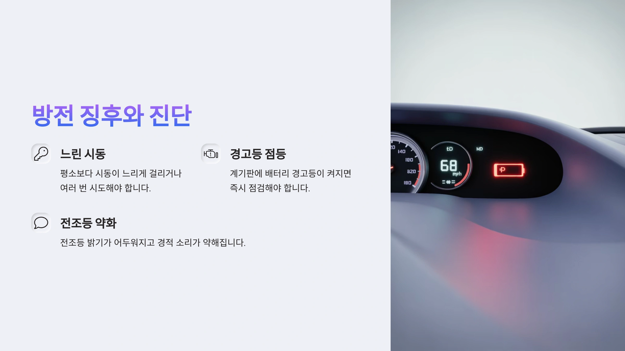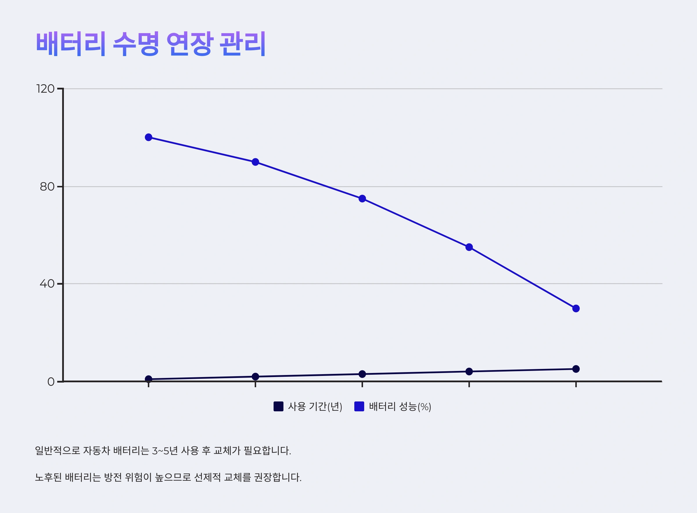 - 배터리 노후화: 자동차 배터리는 영구적으로 사용할 수 있는 부품이 아닙니다. 보통 3년 정도 사용하면 성능이 점차 떨어지기 시작하며, 충전 효율도 낮아져 쉽게 방전될 수 있습니다.