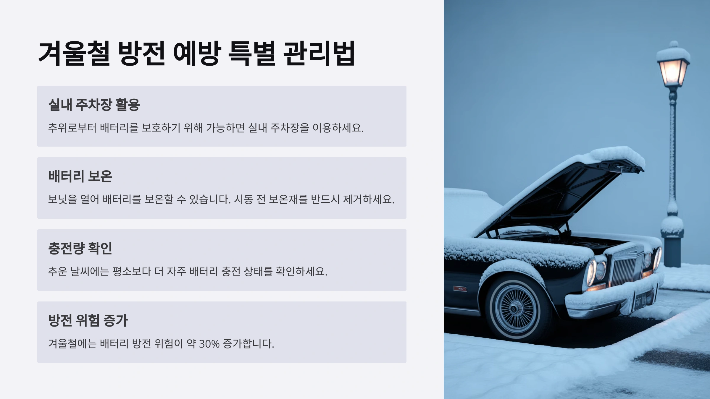 - 혹독한 날씨: 자동차 배터리는 온도에 민감합니다. 특히 기온이 급격히 떨어지는 겨울철에는 배터리 내부의 화학 반응이 둔해져 성능이 20~30%까지 저하될 수 있습니다. 추운 날 유독 방전이 잦은 이유죠.