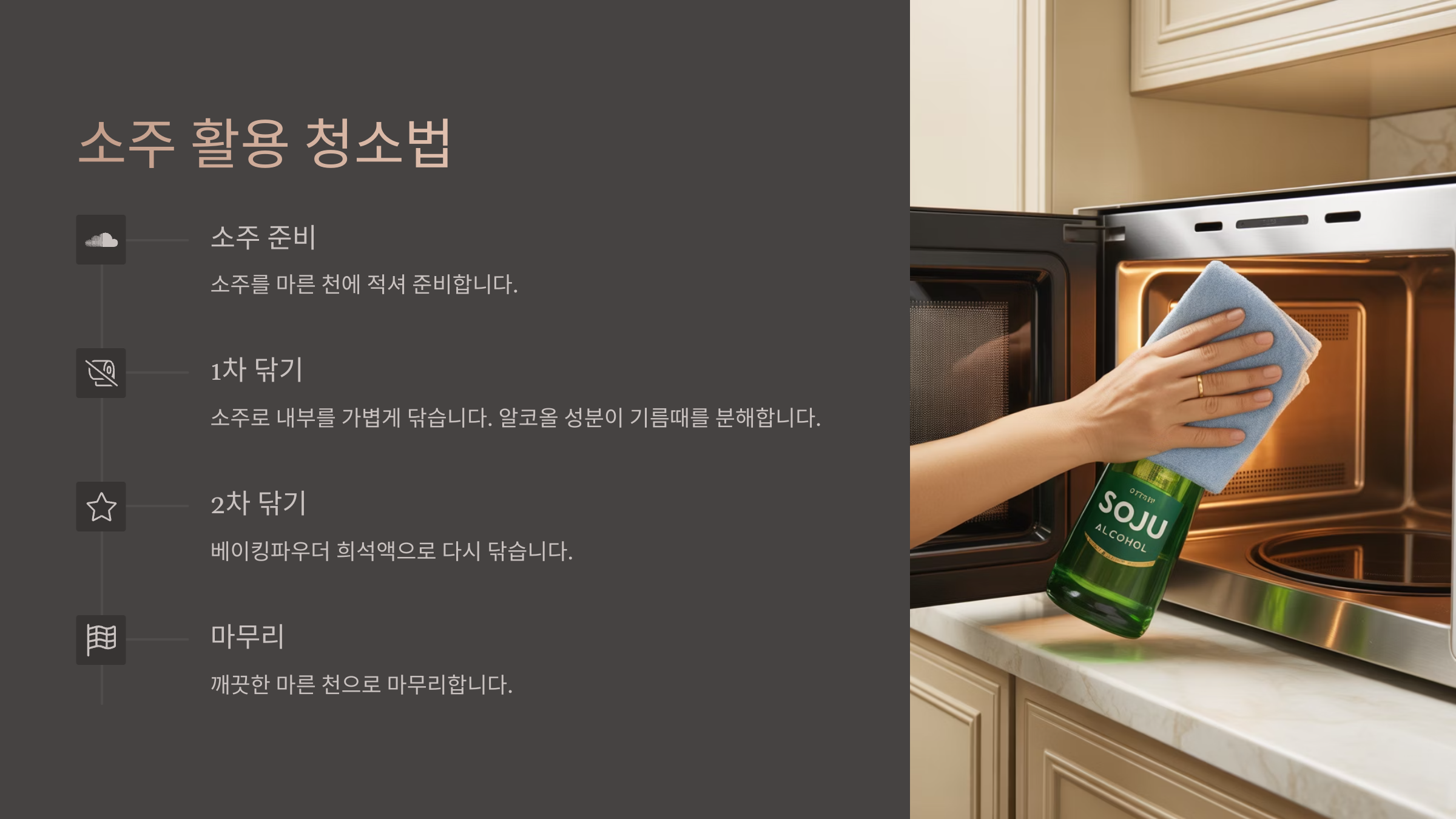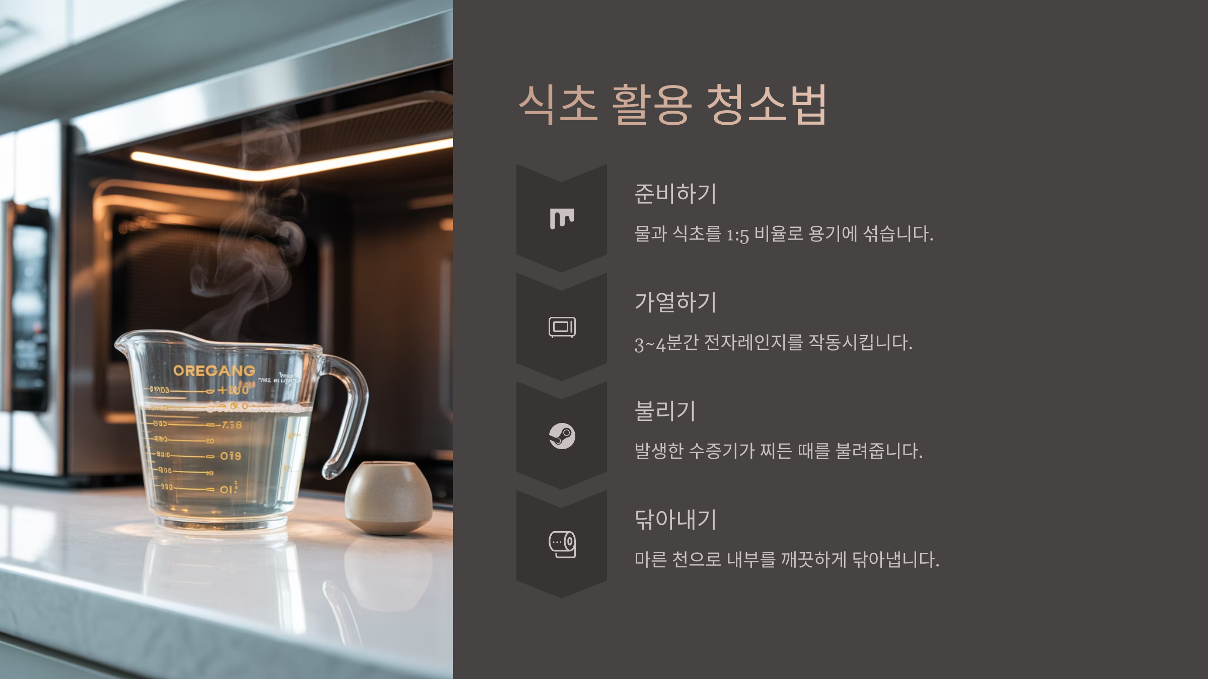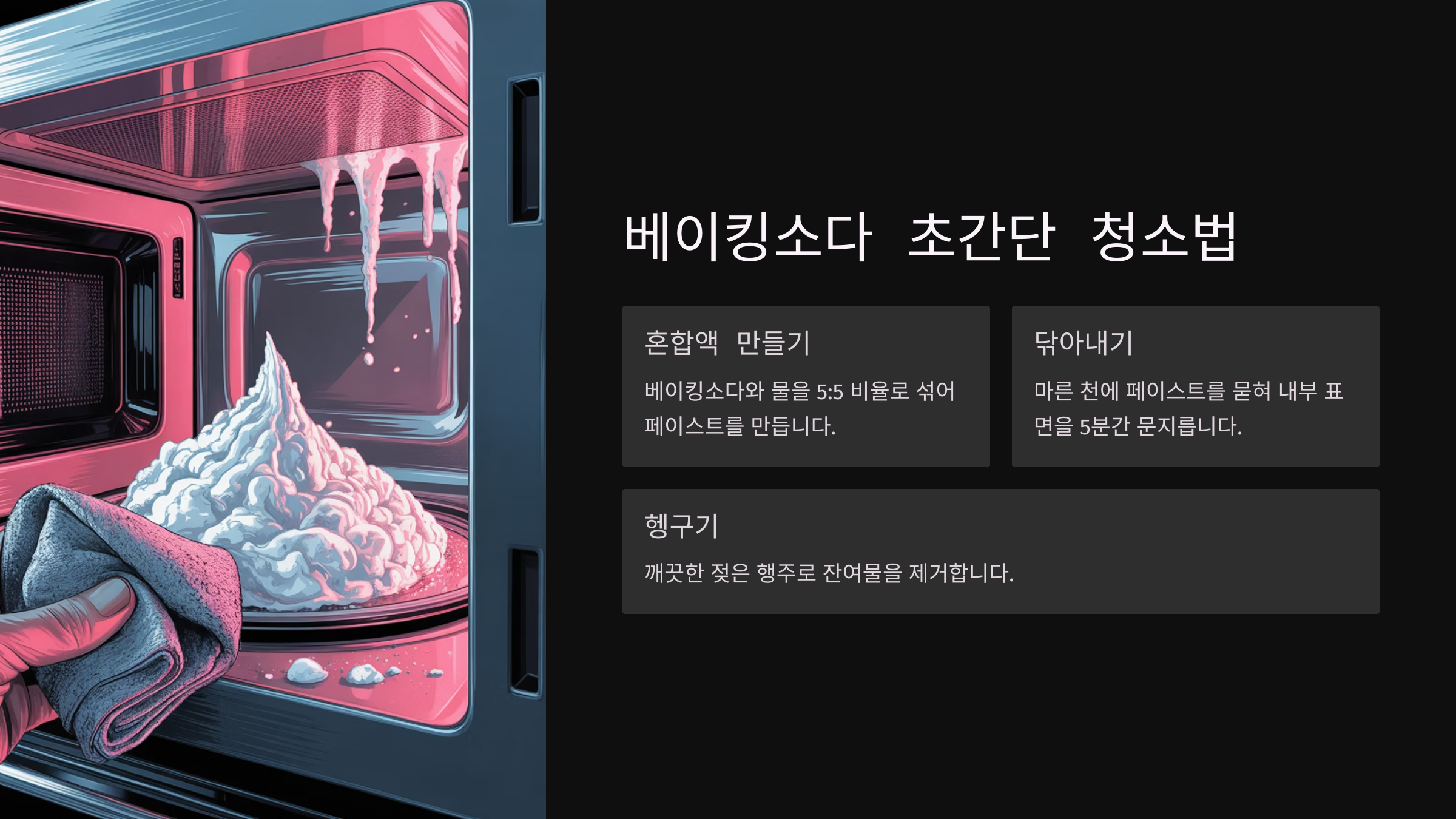 - 시간이 지난 후 문을 열고, 깨끗한 행주나 스펀지로 내부를 닦아내면 끝! 정말 쉽죠?