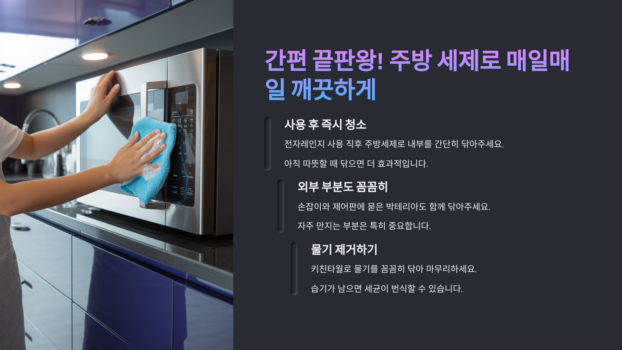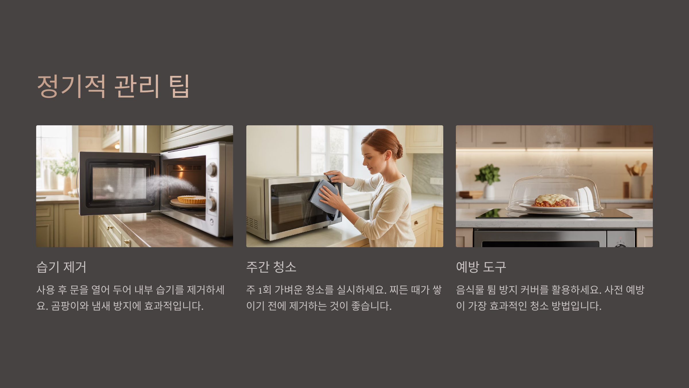 - 매일 사용 후: 음식물이 튀었다면 바로 젖은 행주로 닦아주는 것이 가장 좋아요.