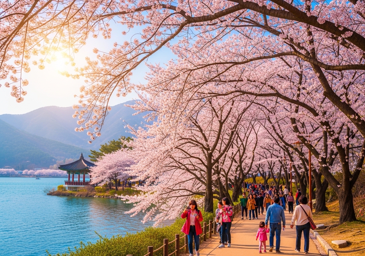 • 벚꽃길의 특별함: 호수 반영으로 만드는 층층이 벚꽃 터널, 비봉산 배경의 수려한 경관