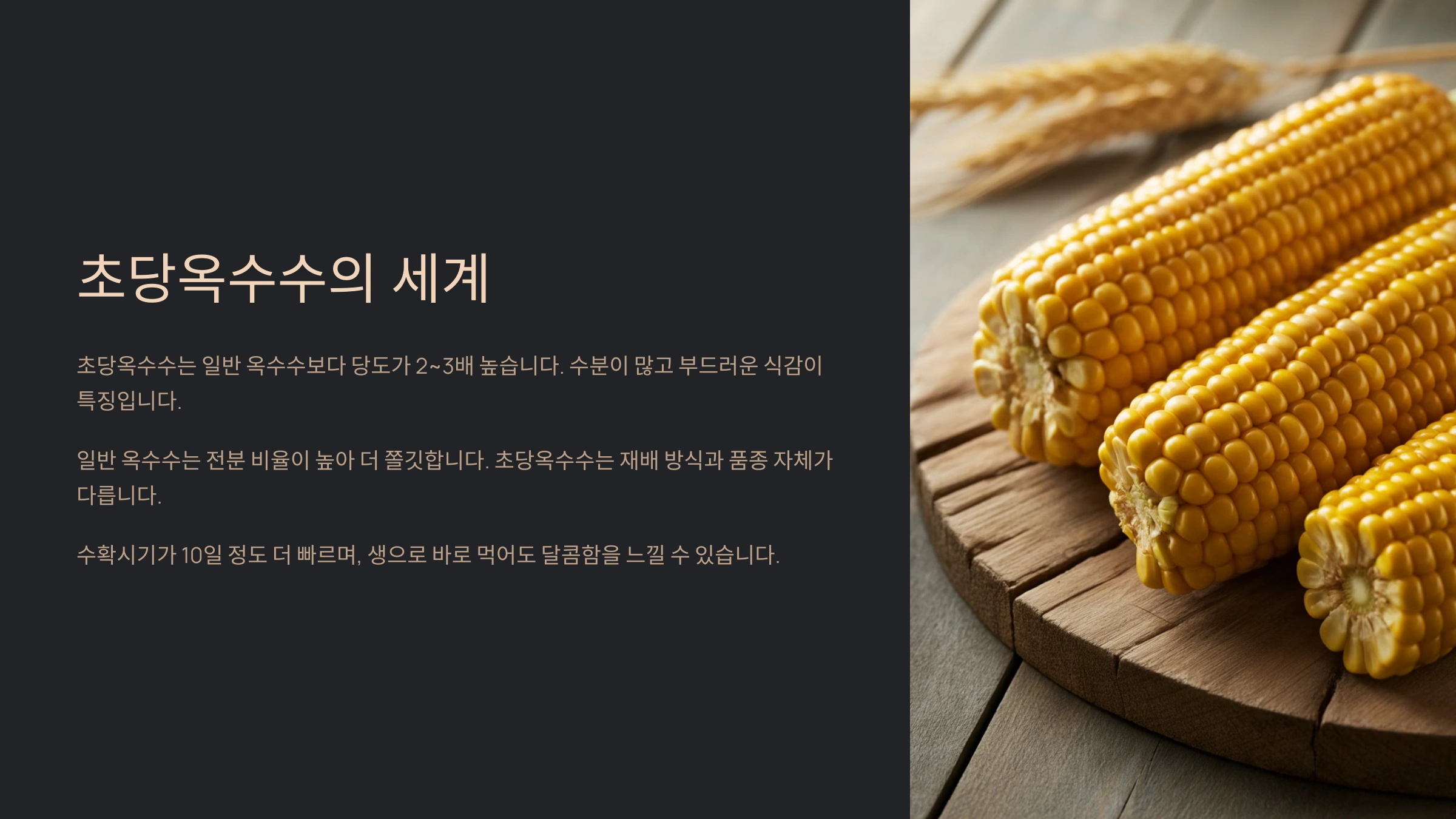 초당옥수수는 이름(超糖, Super Sweet) 그대로 당 함량이 일반 옥수수보다 2~3배나 높은 품종이에요. 일반 옥수수가 전분 특유의 찰지고 구수한 맛이 특징이라면, 초당옥수수는 수분 함량이 높고 전분 함량이 낮아 아삭아삭한 식감과 과일 같은 단맛이 특징이죠.