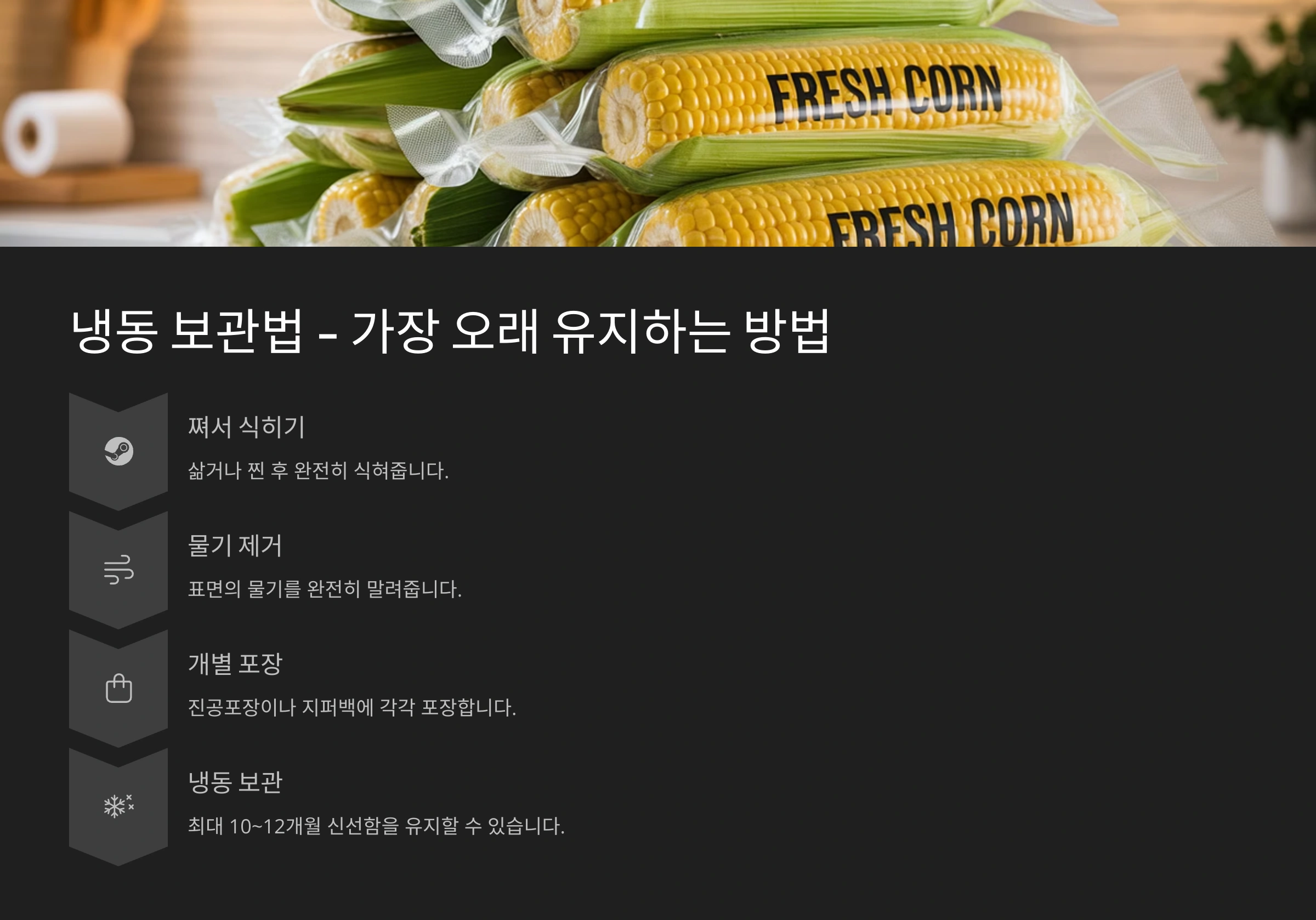 초당옥수수를 대량으로 구매하셨거나, 여름이 지나도 계속 먹고 싶다면 '냉동 보관'이 정답입니다. 냉동 보관 방법은 크게 두 가지가 있어요. 각각 장단점이 있으니 본인에게 맞는 방법을 선택해 보세요.