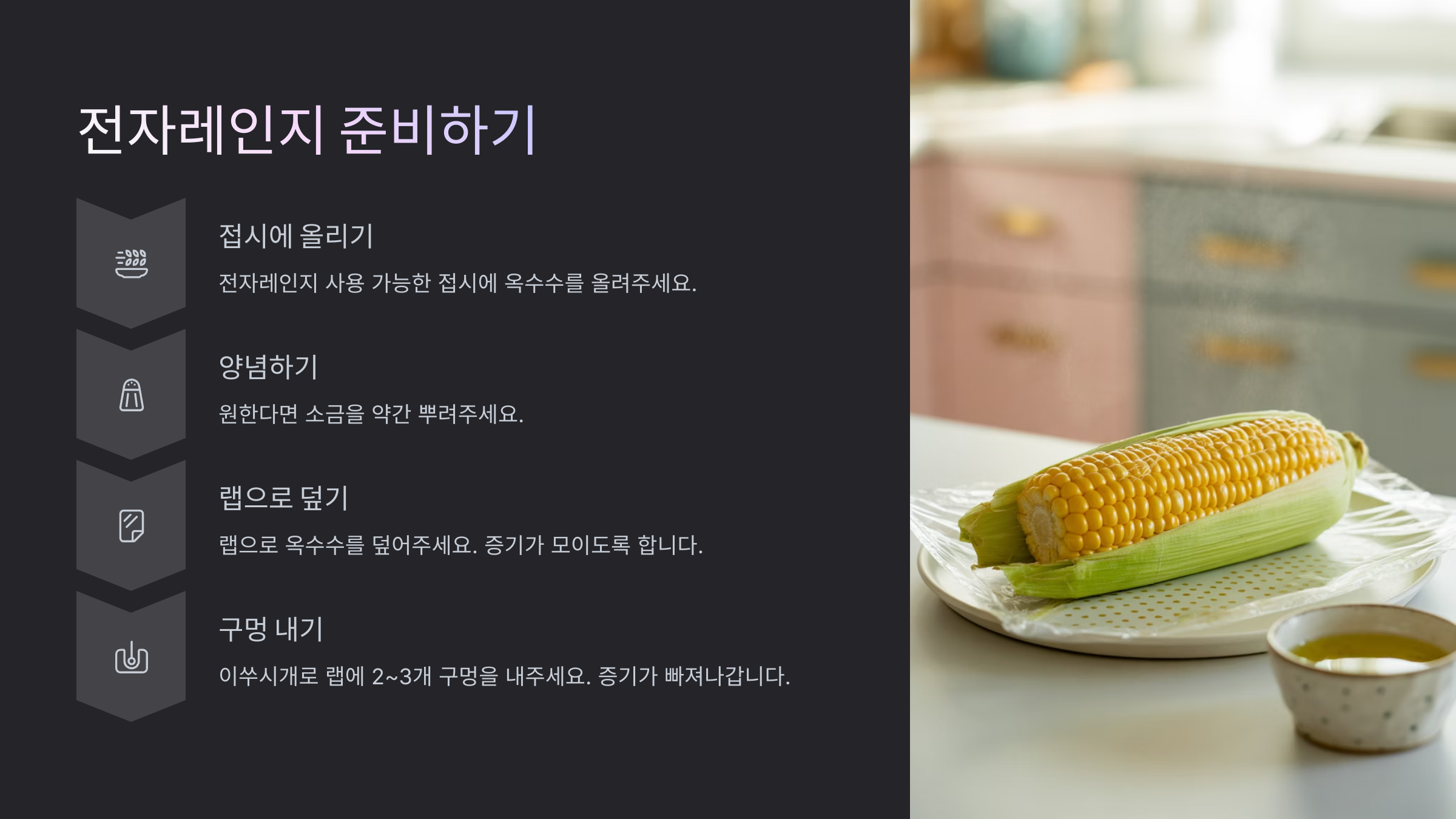 조리가 끝난 직후에는 옥수수와 용기가 매우 뜨겁고, 랩을 벗길 때 뜨거운 증기가 확 나올 수 있어요. 화상에 주의하며 조심스럽게 꺼내주세요! 3~4분 정도 그대로 두어 한 김 식힌 후 꺼내는 것을 추천해요.