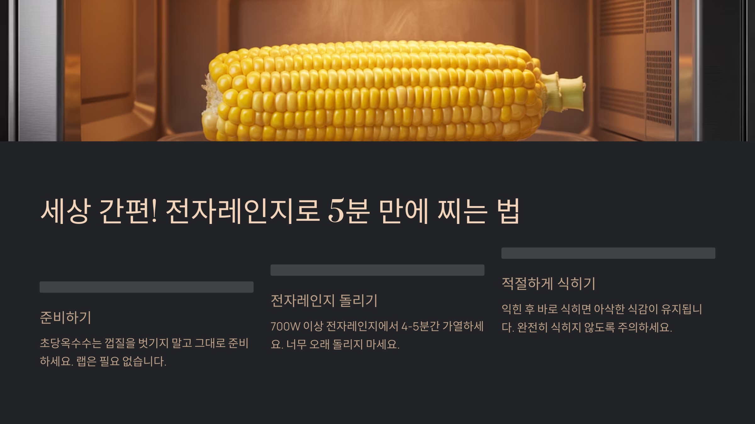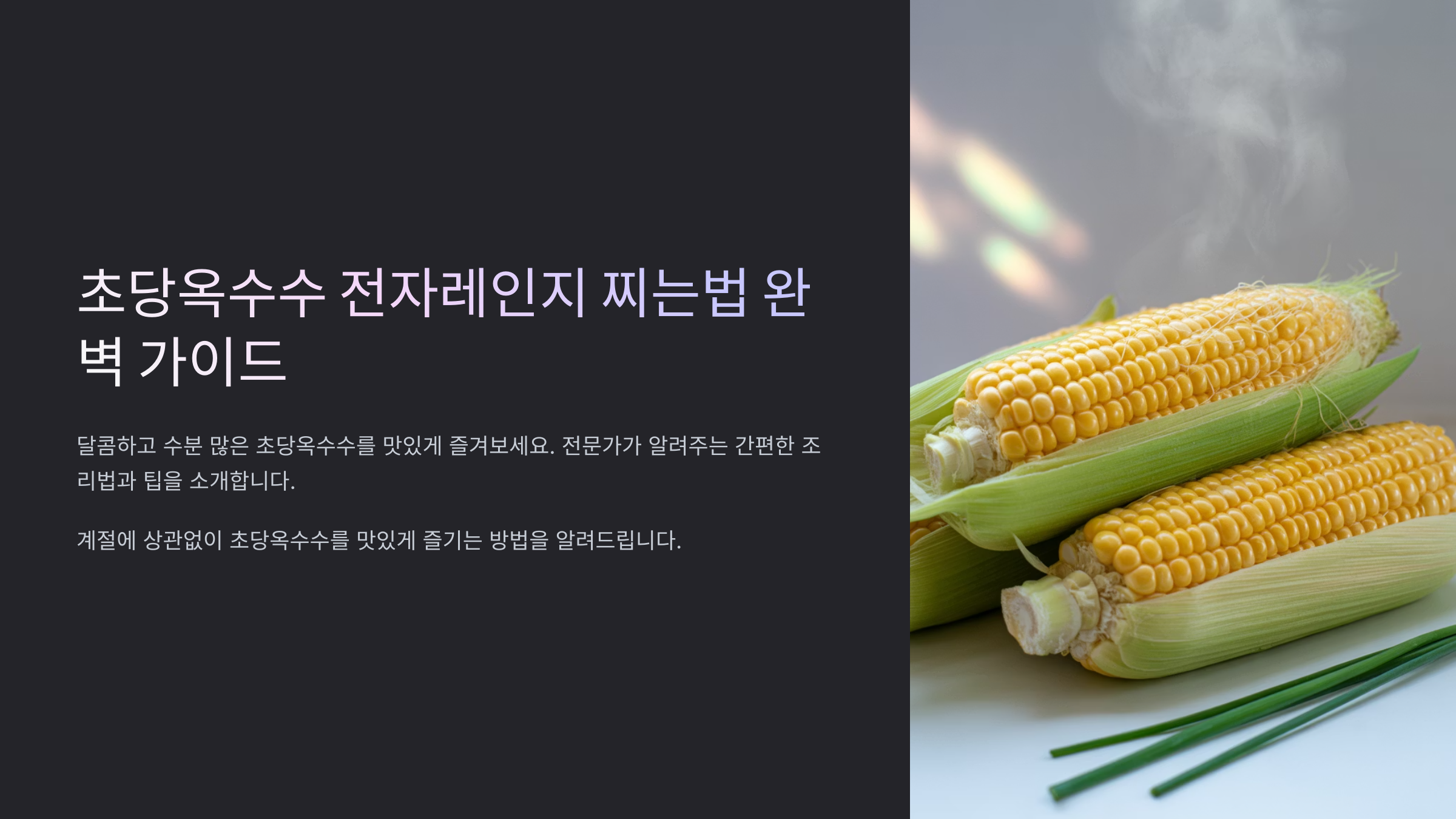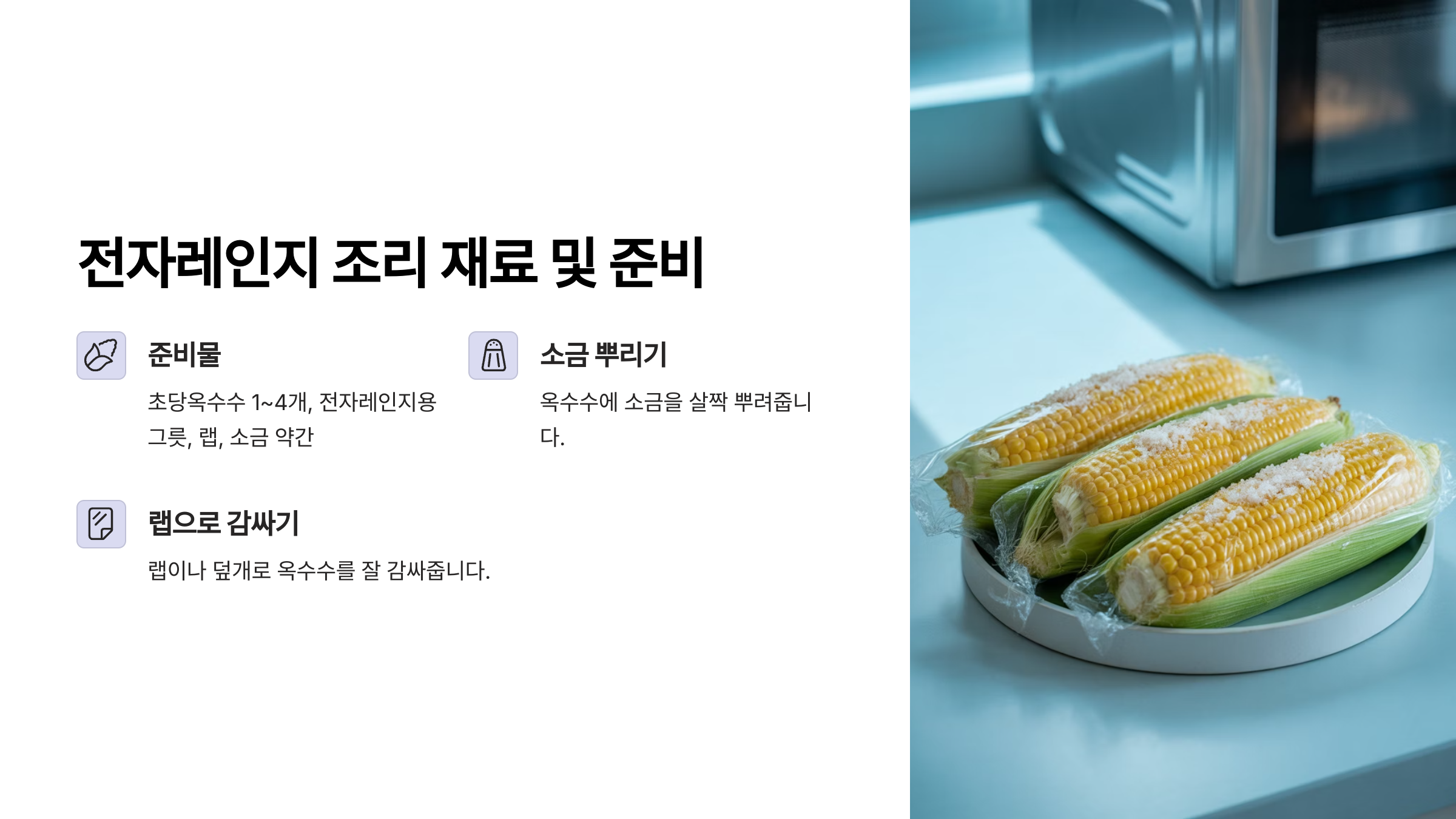 "저는 요리하기 귀찮아요!" 하는 분들을 위한 최고의 방법, 바로 전자레인지입니다. 정말 간편하고 빠르게 초당옥수수를 즐길 수 있어요.