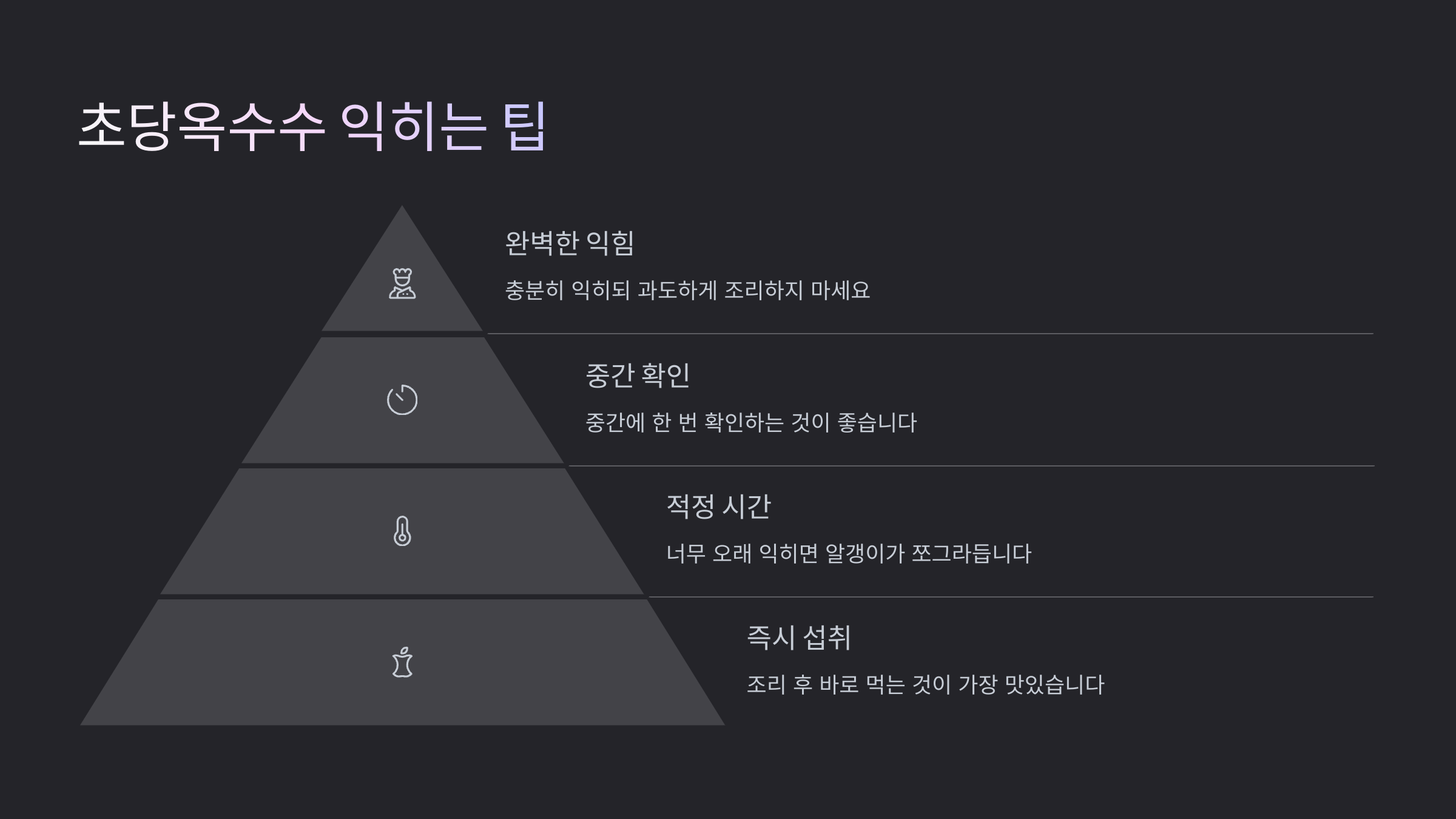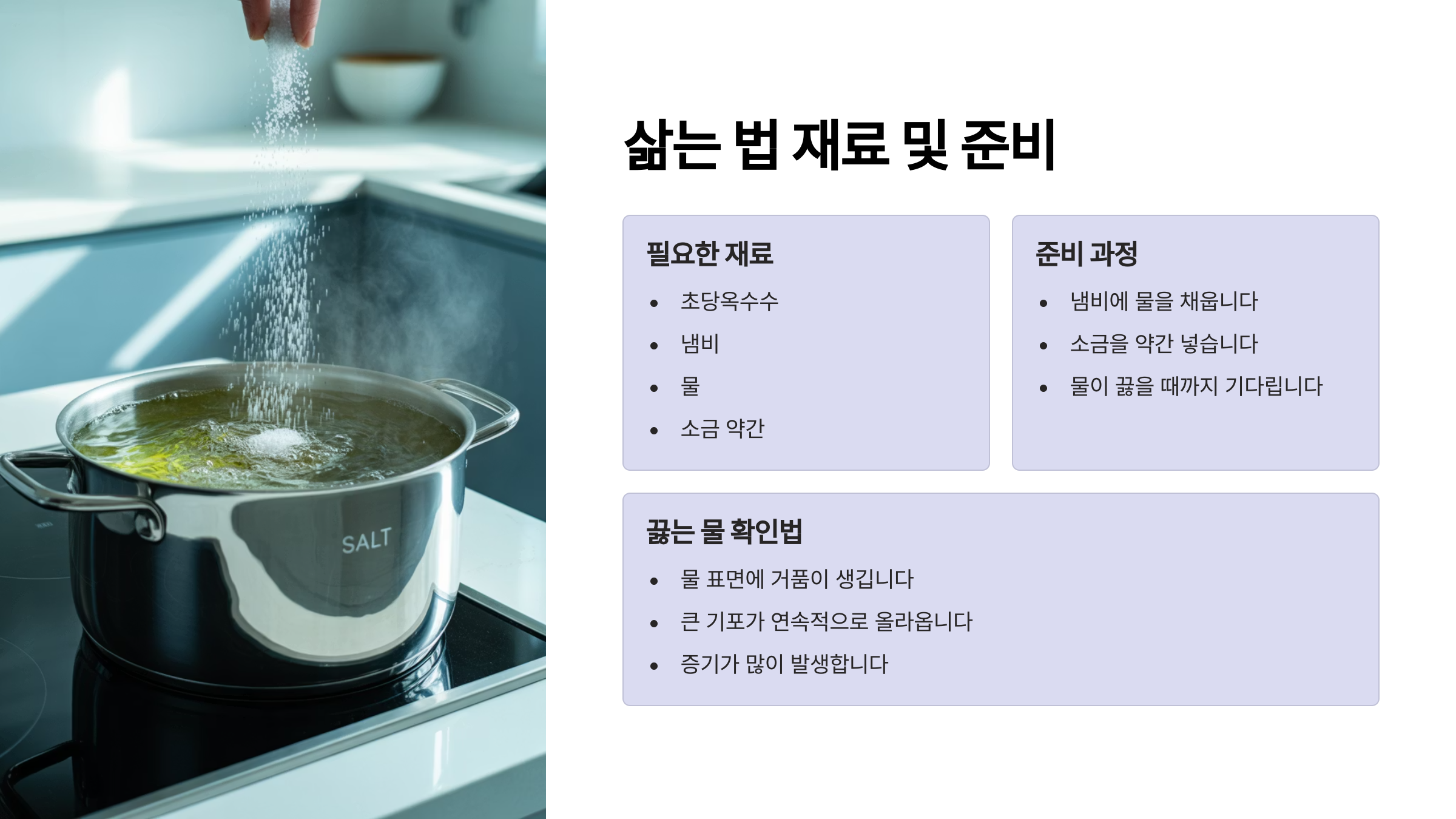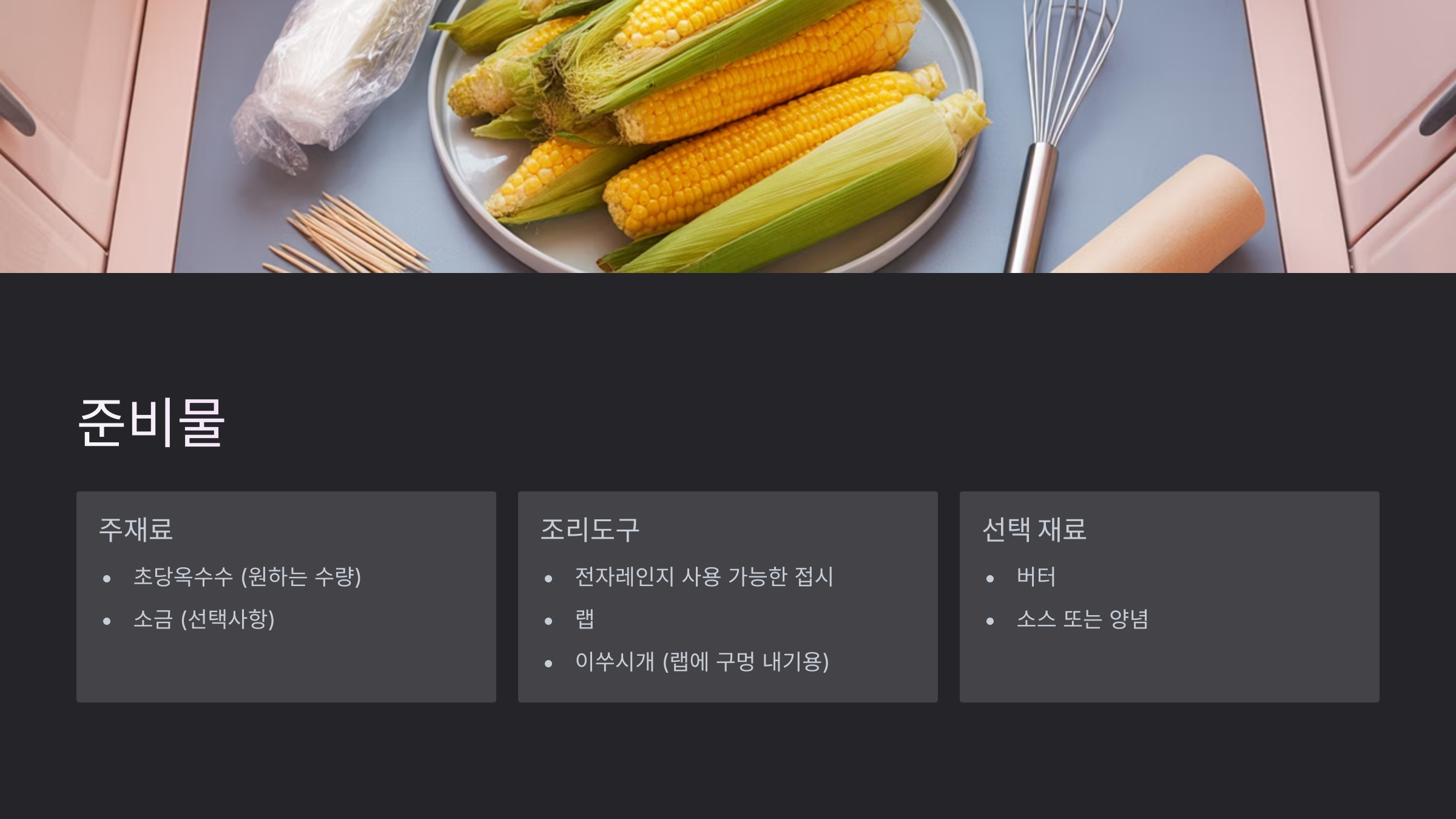 | 찜기 찌기 | 맛, 식감, 영양 보존 최상 | 시간이 다소 걸림, 찜기 필요 | 옥수수 본연의 맛을 즐기고 싶은 분 |