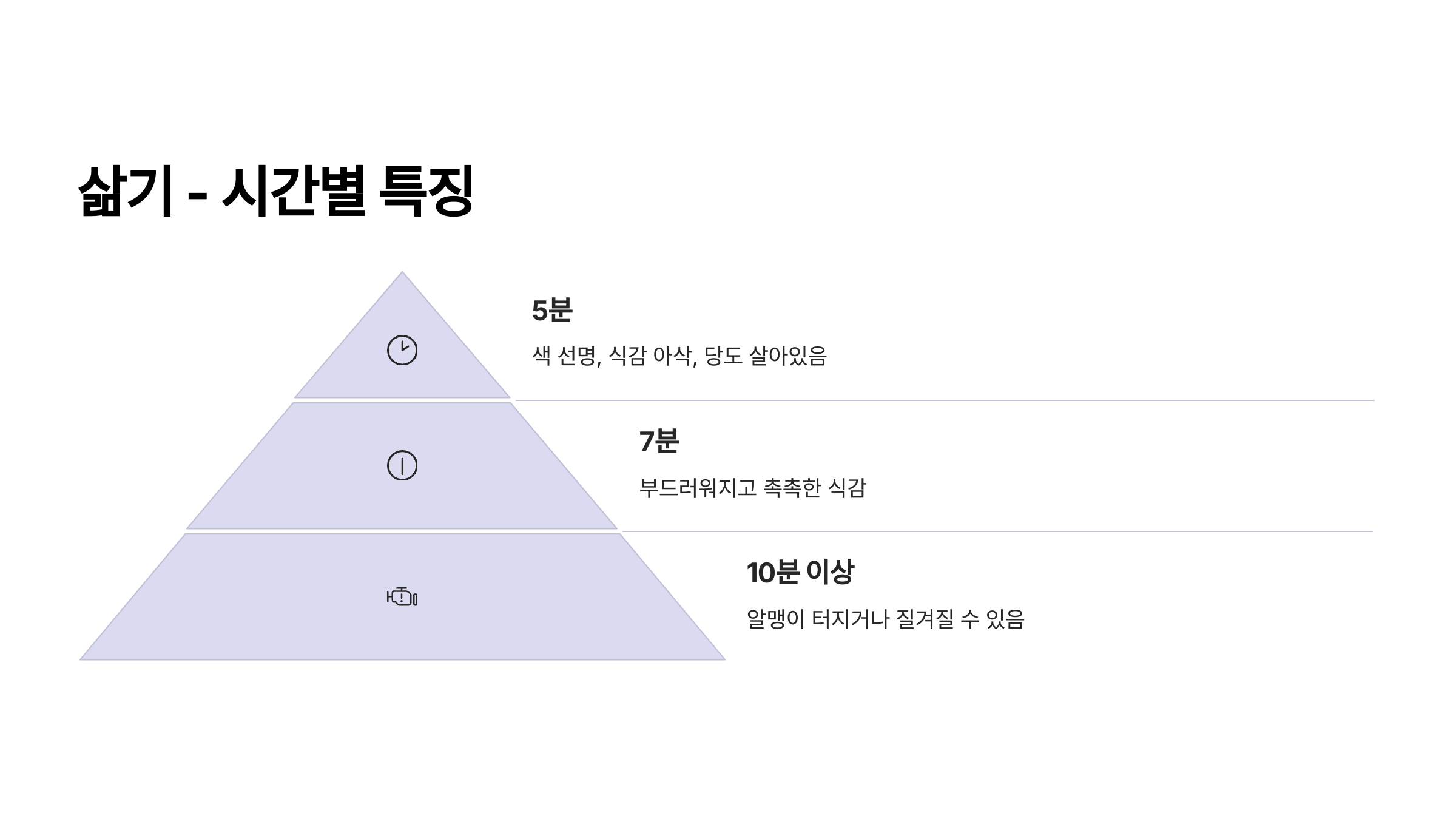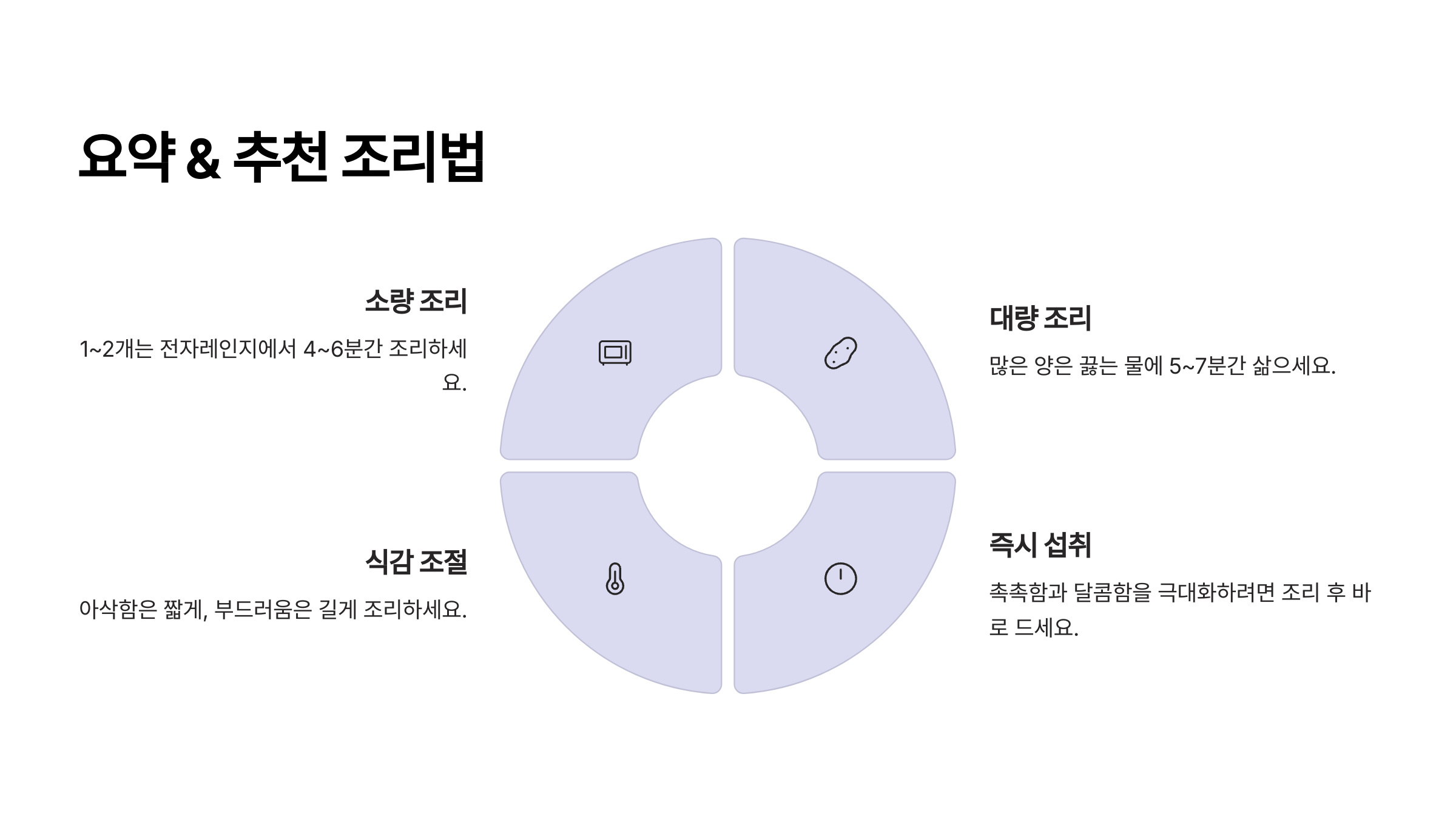 | 물에 삶기 | (딱히 없음) | 단맛과 영양 손실이 큼 | 가급적 피하는 것이 좋음 |