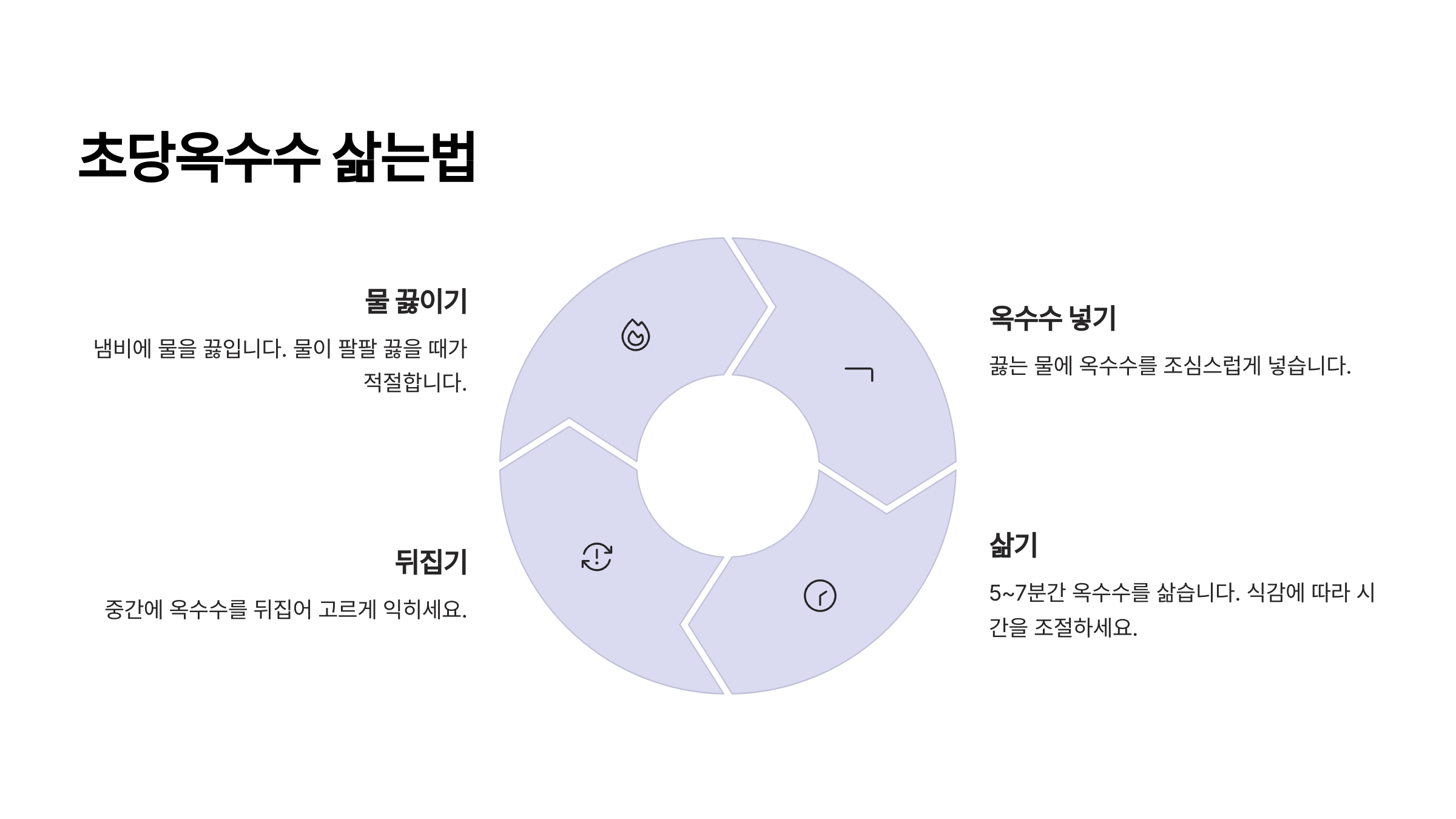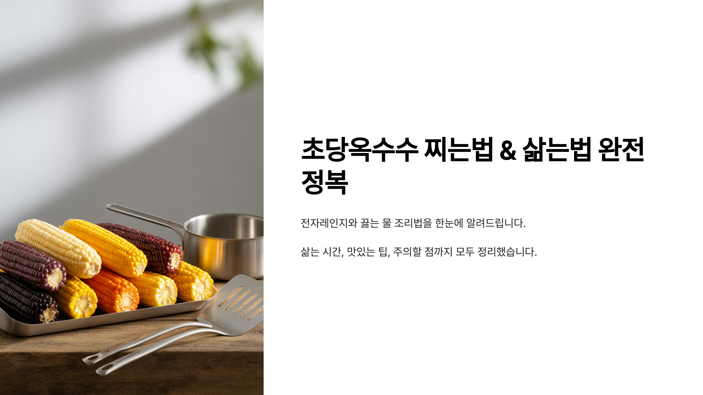 끓는 물에 10~15분! 옥수수 본연의 단맛과 아삭함을 가장 잘 살려요.