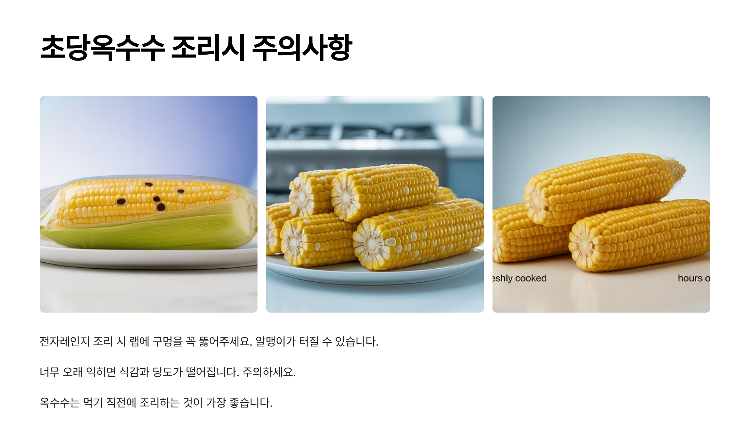 - 전자레인지용 접시나 용기에 옥수수를 담고, 옥수수 1개당 물 1~2큰술을 골고루 뿌려주세요. 이렇게 하면 더 촉촉해져요.