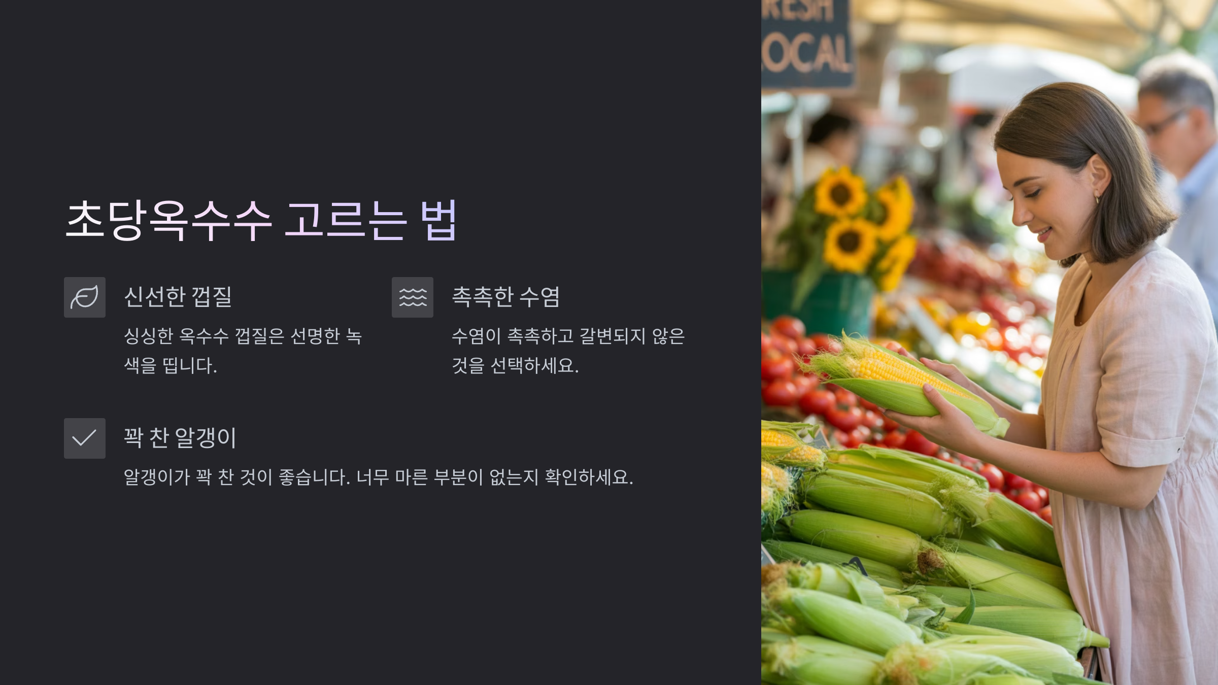 - 옥수수 알맹이 체크: 껍질이 벗겨져 있다면 알맹이를 보세요. 알이 끝까지 꽉 차 있고, 쭈글쭈글하지 않으며 탱글탱글하고 윤기가 나는 것이 좋아요.