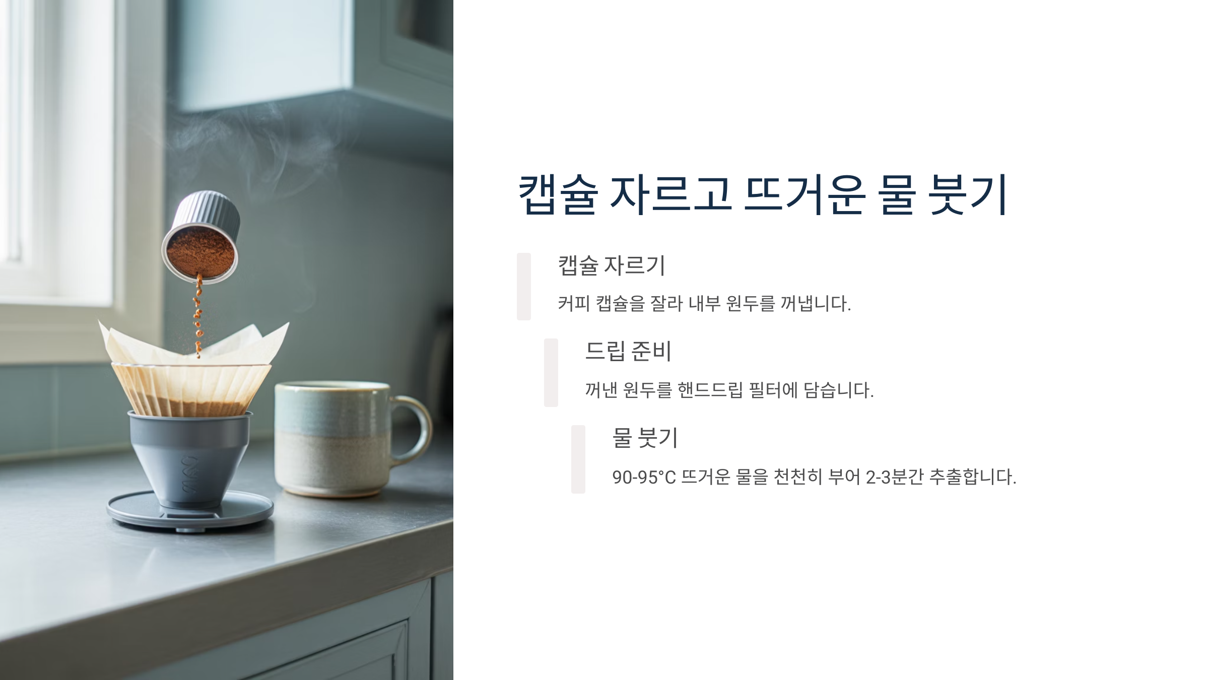 먼저 캡슐을 조심스럽게 절개해서 원두 가루를 꺼낸 뒤, 드립퍼에 종이 필터를 깔고 넣어주세요. 그다음 90~92℃ 정도의 뜨거운 물을 천천히 붓기 시작해요. 처음에는 소량(30ml 정도)만 부어 '뜸들이기'를 해주고, 이후 2~3회에 걸쳐 부드럽게 나눠 붓는 것이 포인트예요.