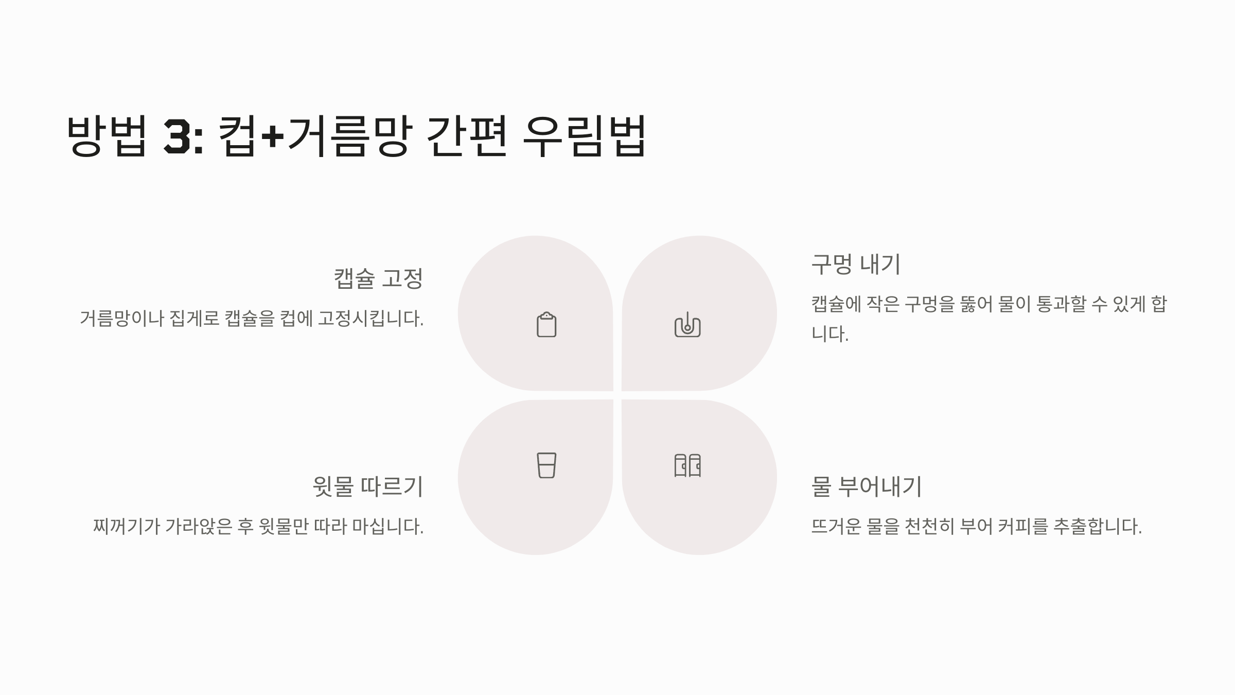 이 방법은 커피 가루가 바로 물에 닿기 때문에 빠르게 우러나지만, 추출 시간이 너무 짧으면 맛이 약할 수 있고, 너무 길면 쓴맛이 강해질 수 있어요. 3분 정도가 가장 적당하다고 알려져 있어요. 맛이 부족하다고 느껴지면, 뜨거운 물을 조금만 덜 넣어 농도를 높여보세요.