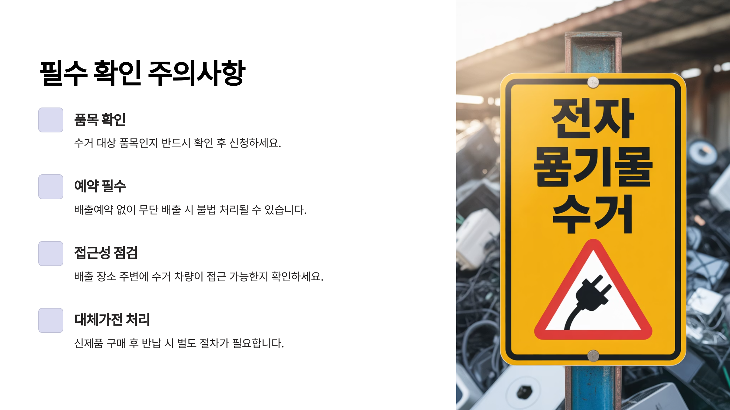 무료라고 해서 모든 걸 다 가져가는 건 아니에요. 수거가 거부될 수 있는 몇 가지 중요한 예외사항이 있으니 신청 전에 꼭 확인해주세요!